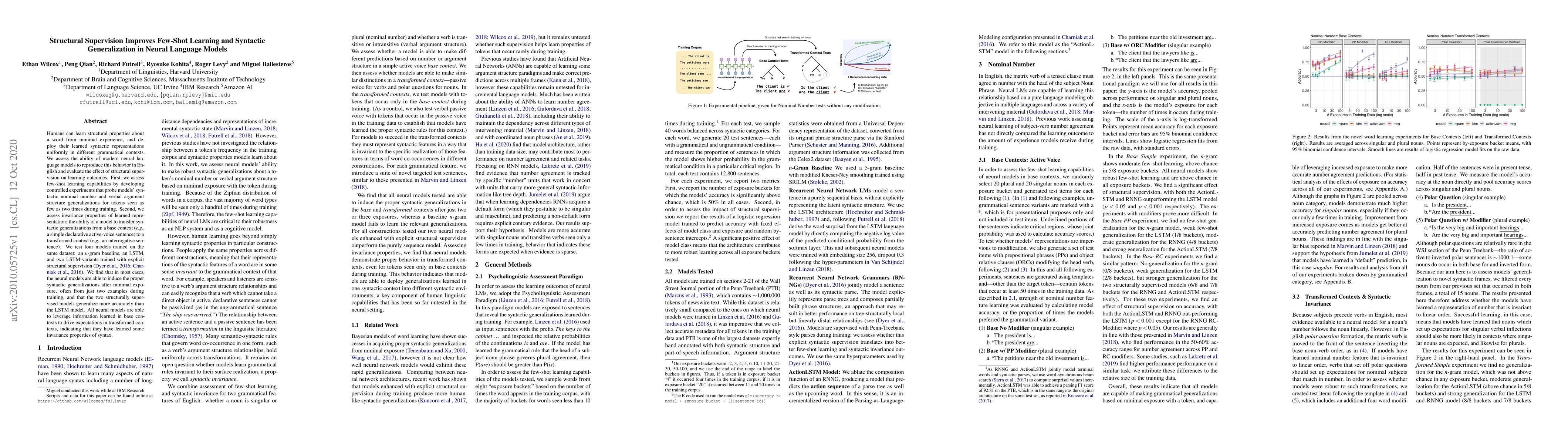 Humans can learn structural properties about a word from minimal experience, and deploy their learned syntactic representations uniformly in different grammatical contexts. We assess the ability of modern neural language models to reproduce this behavior in English and evaluate the effect of structural supervision on learning outcomes. First, we assess few-shot learning capabilities by developing controlled experiments that probe models' syntactic nominal number and verbal argument structure generalizations for tokens seen as few as two times during training. Second, we assess invariance properties of learned representation: the ability of a model to transfer syntactic generalizations from a base context (e.g., a simple declarative active-voice sentence) to a transformed context (e.g., an interrogative sentence). We test four models trained on the same dataset: an n-gram baseline, an LSTM, and two LSTM-variants trained with explicit structural supervision (Dyer et al.,2016; Charniak et al., 2016). We find that in most cases, the neural models are able to induce the proper syntactic generalizations after minimal exposure, often from just two examples during training, and that the two structurally supervised models generalize more accurately than the LSTM model. All neural models are able to leverage information learned in base contexts to drive expectations in transformed contexts, indicating that they have learned some invariance properties of syntax.