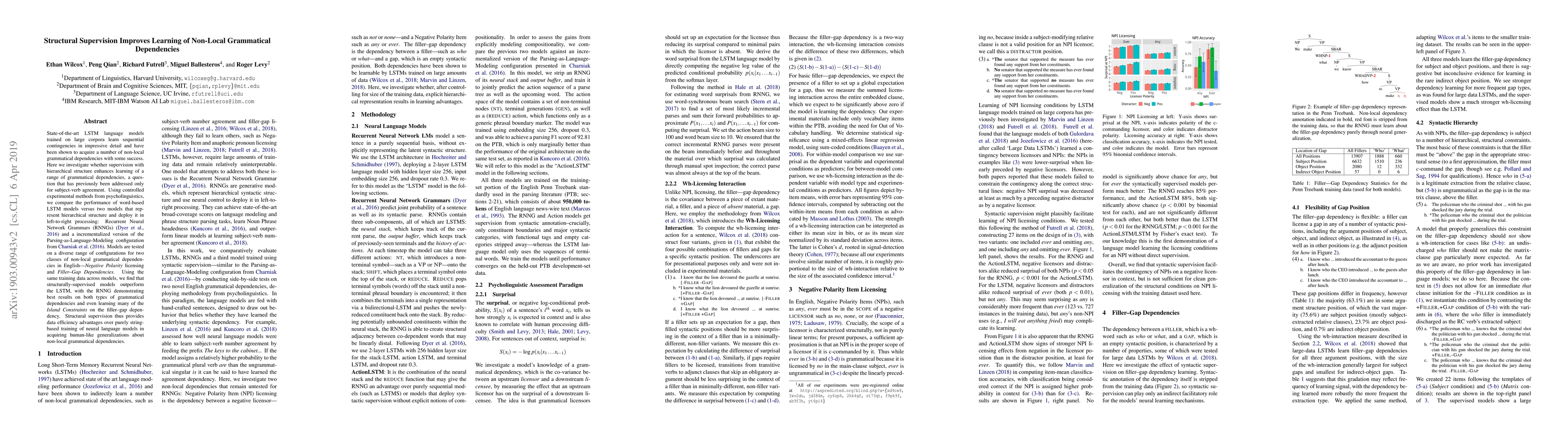 This study investigates how structural supervision improves the learning of non-local grammatical dependencies in neural language models. Structurally-supervised models, specifically RNNGs, outperform purely sequential LSTM models in acquiring complex grammatical dependencies, demonstrating data efficiency and human-like generalization.
