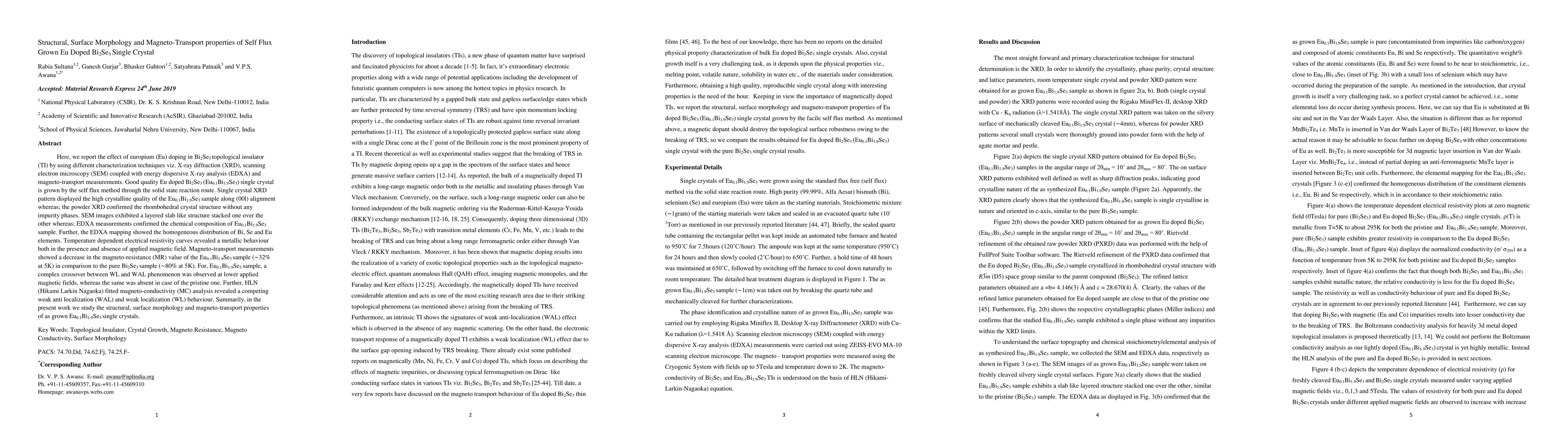 This research paper investigates the effects of europium doping on Bi2Se3 single crystals, revealing a metallic behavior under both magnetic and non-magnetic conditions, with unique magneto-transport properties.