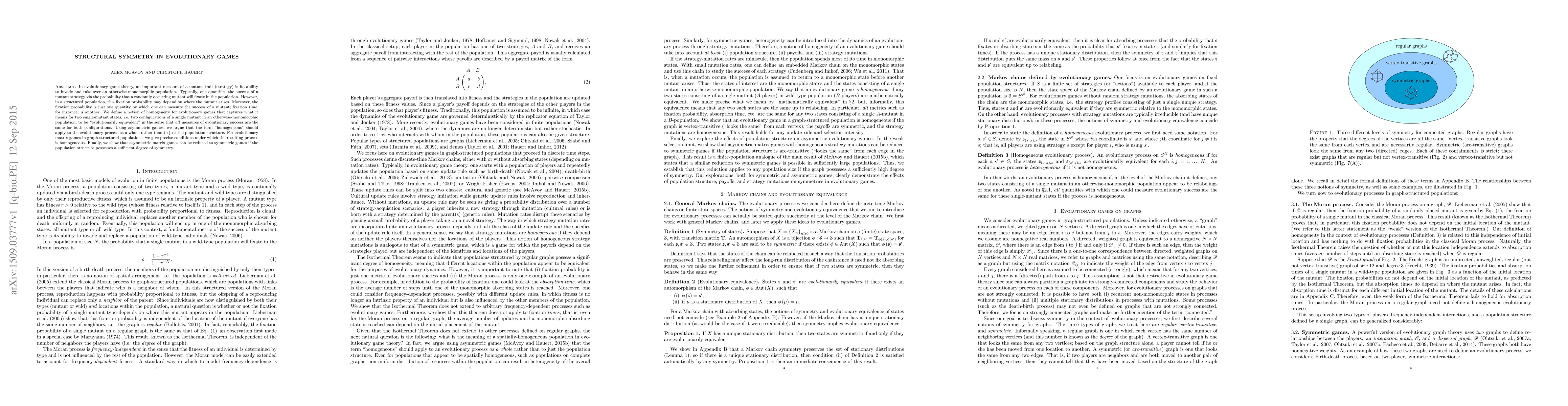 This paper explores the concept of structural symmetry in evolutionary games, defining "homogeneity" for mutant strategies in structured populations. It establishes conditions for evolutionary matrix games in graph-structured populations to be homogeneous, and shows that asymmetric games can be reduced to symmetric games under sufficient structural symmetry.