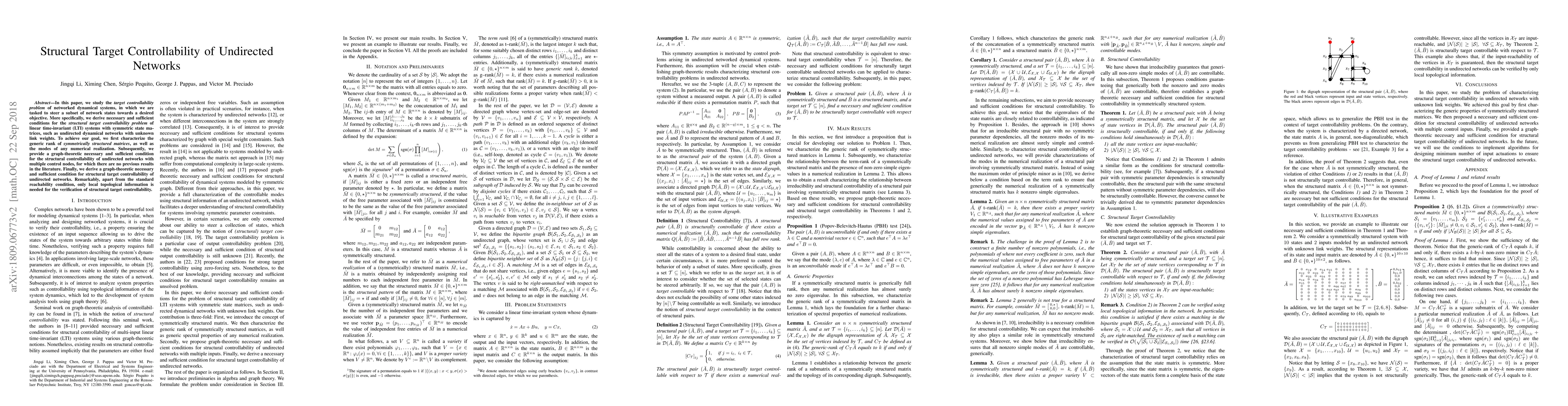 In this paper, we study the target controllability problem of networked dynamical systems, in which we are tasked to steer a subset of network states towards a desired objective. More specifically, we derive necessary and sufficient conditions for the structural target controllability problem of linear time-invariant (LTI) systems with symmetric state matrices, such as undirected dynamical networks with unknown link weights. To achieve our goal, we first characterize the generic rank of symmetrically structured matrices, as well as the modes of any numerical realization. Subsequently, we provide a graph-theoretic necessary and sufficient condition for the structural controllability of undirected networks with multiple control nodes. Finally, we derive a graph-theoretic necessary and sufficient condition for structural target controllability of undirected networks. Remarkably, apart from the standard reachability condition, only local topological information is needed for the verification of structural target controllability.