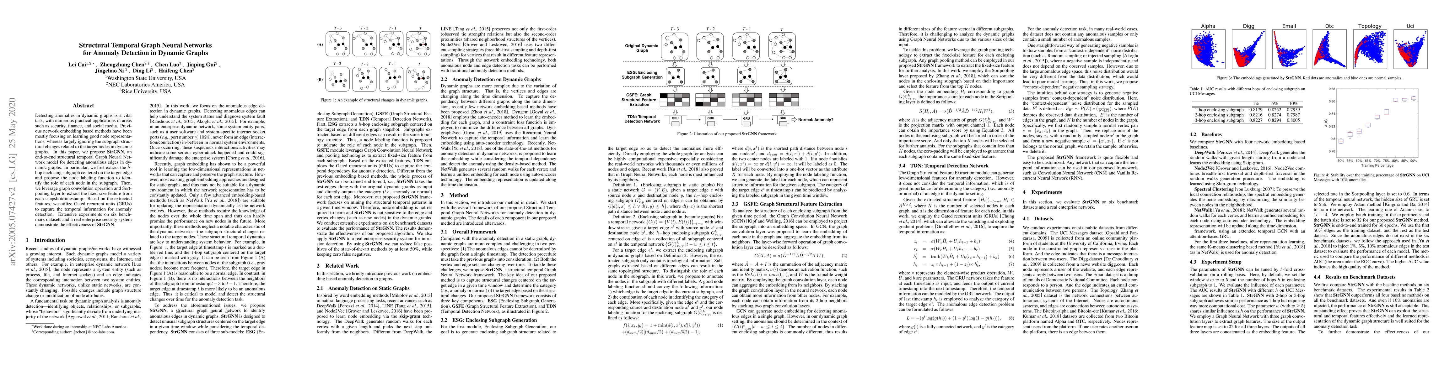 This paper proposes StrGNN, a structural temporal Graph Neural Network for detecting anomalous edges in dynamic graphs by focusing on subgraph structural changes and temporal information. The model uses $h$-hop subgraphs, node labeling, graph convolutions, Sortpooling, and GRUs to capture temporal dynamics, showing effectiveness in anomaly detection across multiple datasets.