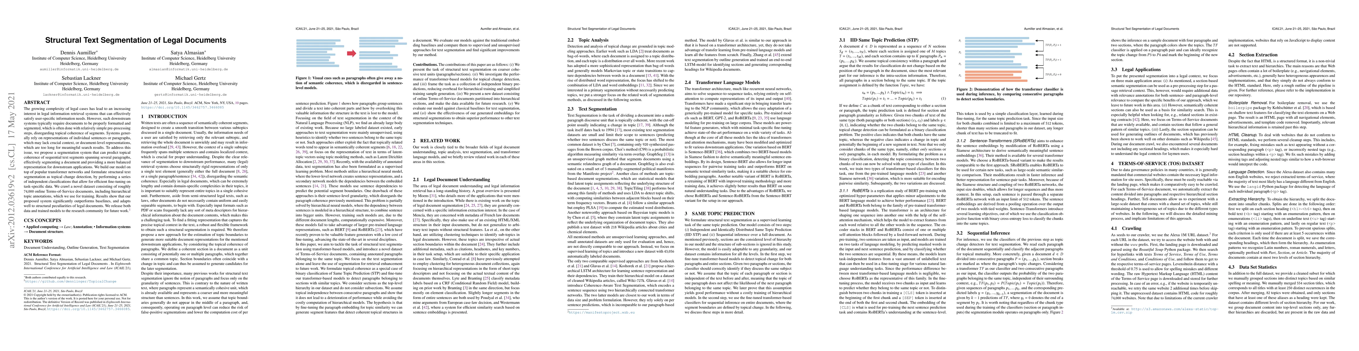 This paper proposes a segmentation system for legal documents that predicts topical coherence across multiple paragraphs, addressing the limitations of existing methods that use simple pre-processing or lack context. The model, built on transformer networks, outperforms baselines and is trained on a large dataset of annotated Terms-of-Service documents, with data and models released for further research.