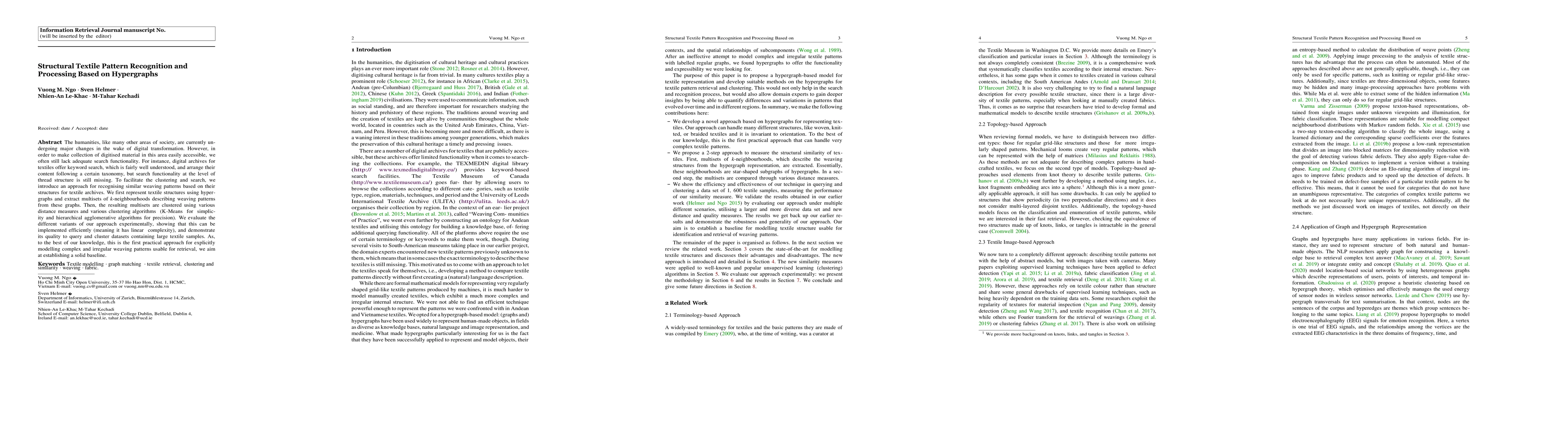 The humanities, like many other areas of society, are currently undergoing major changes in the wake of digital transformation. However, in order to make collection of digitised material in this area easily accessible, we often still lack adequate search functionality. For instance, digital archives for textiles offer keyword search, which is fairly well understood, and arrange their content following a certain taxonomy, but search functionality at the level of thread structure is still missing. To facilitate the clustering and search, we introduce an approach for recognising similar weaving patterns based on their structures for textile archives. We first represent textile structures using hypergraphs and extract multisets of k-neighbourhoods describing weaving patterns from these graphs. Then, the resulting multisets are clustered using various distance measures and various clustering algorithms (K-Means for simplicity and hierarchical agglomerative algorithms for precision). We evaluate the different variants of our approach experimentally, showing that this can be implemented efficiently (meaning it has linear complexity), and demonstrate its quality to query and cluster datasets containing large textile samples. As, to the est of our knowledge, this is the first practical approach for explicitly modelling complex and irregular weaving patterns usable for retrieval, we aim at establishing a solid baseline.