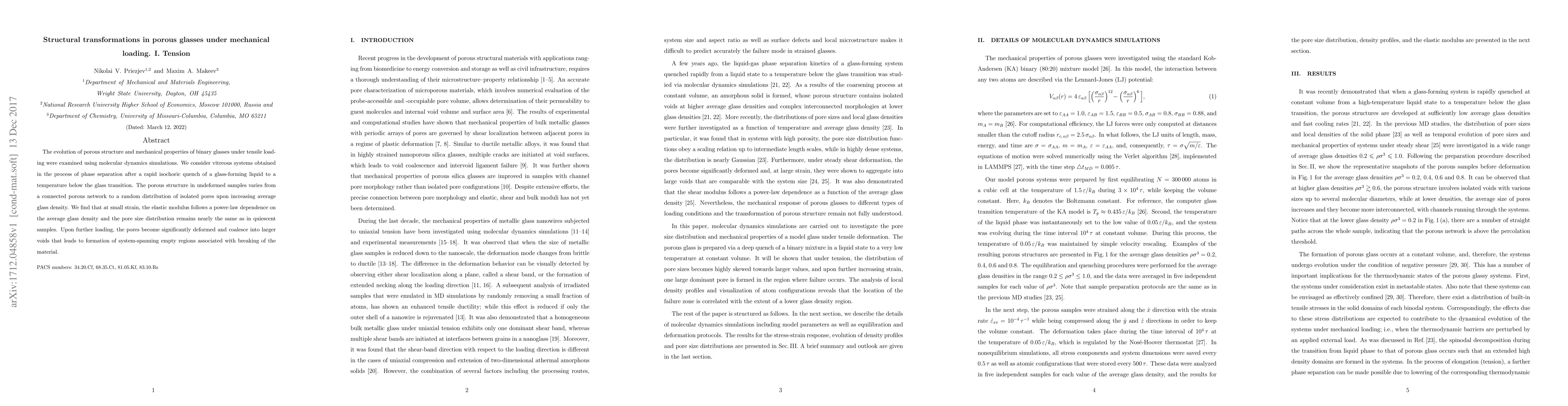 The evolution of porous structure and mechanical properties of binary glasses under tensile loading were examined using molecular dynamics simulations. We consider vitreous systems obtained in the process of phase separation after a rapid isochoric quench of a glass-forming liquid to a temperature below the glass transition. The porous structure in undeformed samples varies from a connected porous network to a random distribution of isolated pores upon increasing average glass density. We find that at small strain, the elastic modulus follows a power-law dependence on the average glass density and the pore size distribution remains nearly the same as in quiescent samples. Upon further loading, the pores become significantly deformed and coalesce into larger voids that leads to formation of system-spanning empty regions associated with breaking of the material.