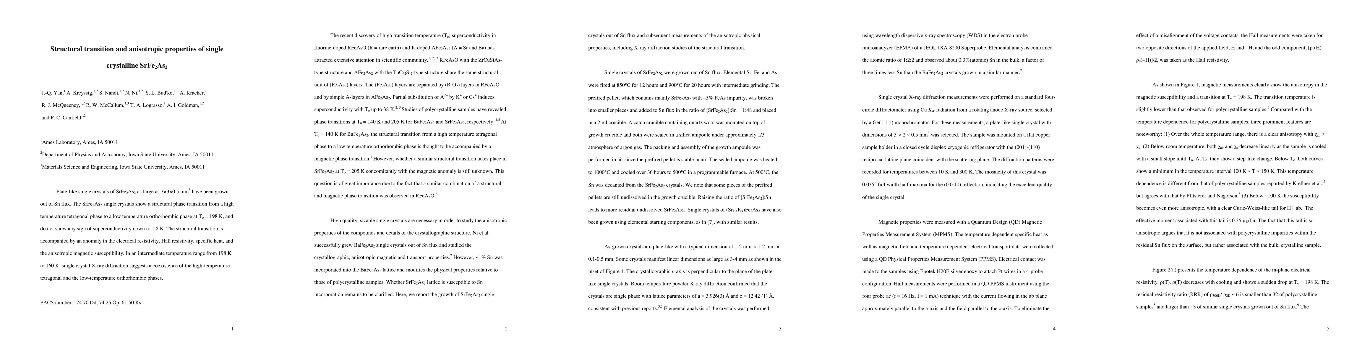This paper investigates SrFe2As2 single crystals, revealing a structural phase transition from tetragonal to orthorhombic at 198 K, accompanied by anomalies in resistivity, Hall resistivity, specific heat, and magnetic susceptibility. No superconductivity is observed below 1.8 K, and an intermediate phase coexistence is suggested by X-ray diffraction.