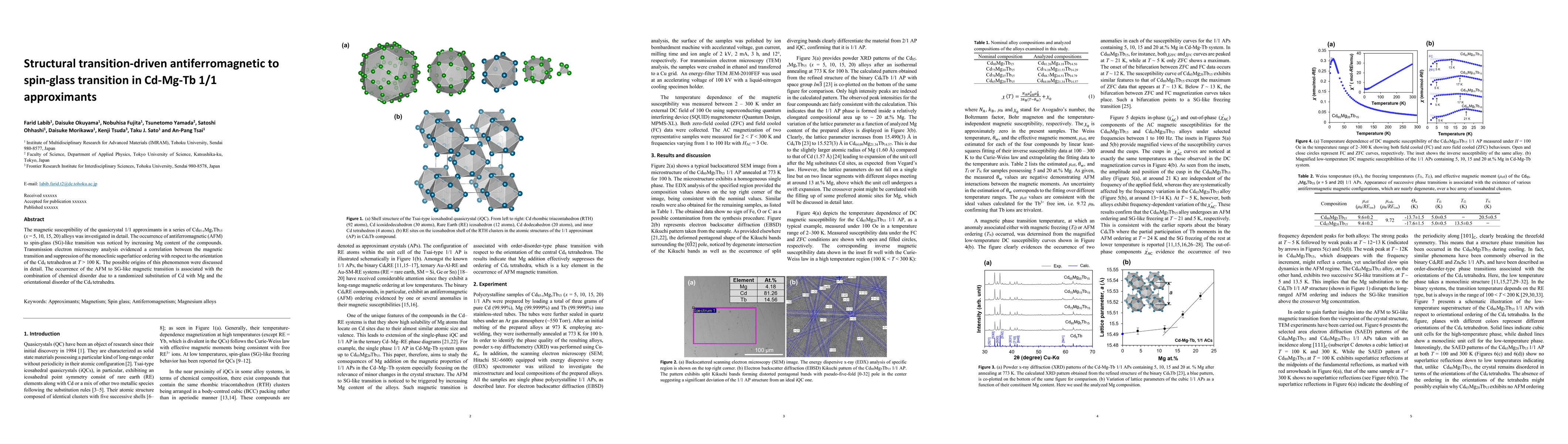 The magnetic susceptibility of the 1/1 approximants to icosahedral quasicrystals in a series of Cd85-xMgxTb15 (x = 5, 10, 15, 20) alloys was investigated in detail. The occurrence of antiferromagnetic to spin-glass-like transition was noticed by increasing Mg. Transmission electron microscopy analysis evidenced a correlation between the magnetic transition and suppression of the monoclinic superlattice ordering with respect to the orientation of the Cd4 tetrahedron at T > 100 K. The possible origins of this phenomenon were discussed in detail. The occurrence of the antiferromagnetic to spin-glass -like magnetic transition is associated with the combination of chemical disorder due to a randomized substitution of Cd with Mg and the orientational disorder of the Cd4 tetrahedra.