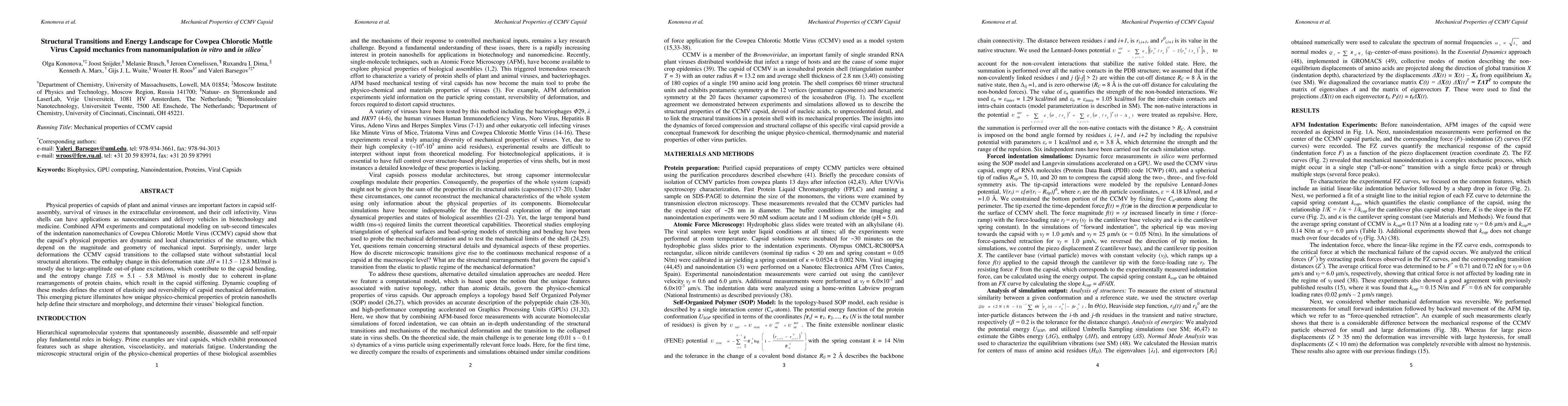 This study combines atomic force microscopy and computational modeling to investigate the dynamic mechanical properties of Cowpea Chlorotic Mottle Virus capsids. It reveals that the capsid undergoes a transition to a collapsed state under large deformations, highlighting the interplay between structural elasticity and entropy changes that define the capsid's mechanical behavior and biological function.
