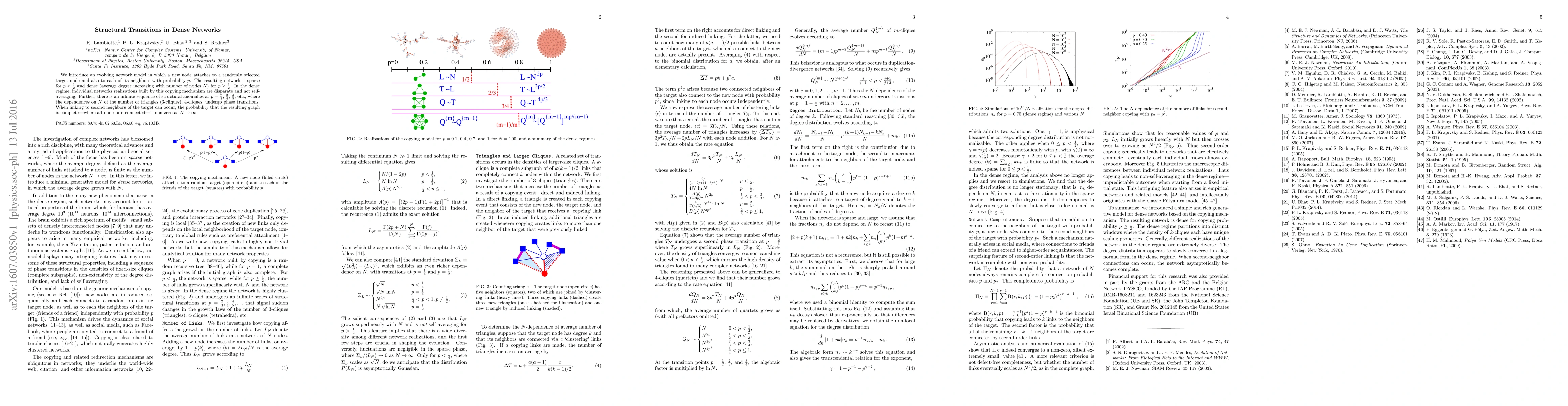 We introduce an evolving network model in which a new node attaches to a randomly selected target node and also to each of its neighbors with probability $p$. The resulting network is sparse for $p<\frac{1}{2}$ and dense (average degree increasing with number of nodes $N$) for $p\geq \frac{1}{2}$. In the dense regime, individual networks realizations built by this copying mechanism are disparate and not self-averaging. Further, there is an infinite sequence of structural anomalies at $p=\frac{2}{3}$, $\frac{3}{4}$, $\frac{4}{5}$, etc., where the dependences on $N$ of the number of triangles (3-cliques), 4-cliques, undergo phase transitions. When linking to second neighbors of the target can occur, the probability that the resulting graph is complete---where all nodes are connected---is non-zero as $N\to\infty$.