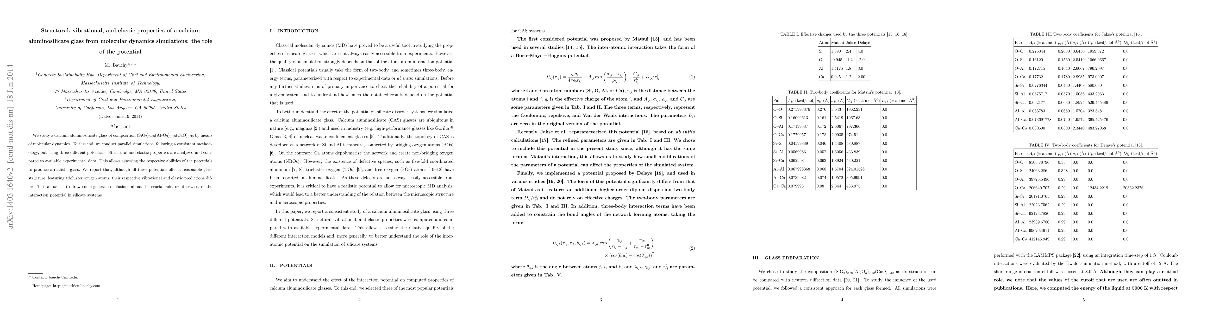 This study investigates the structural, vibrational, and elastic properties of a calcium aluminosilicate glass using molecular dynamics simulations with three different potentials. While all potentials provide a realistic glass structure, their predictions for vibrational and elastic properties differ, highlighting the significant role of the interaction potential in silicate systems.