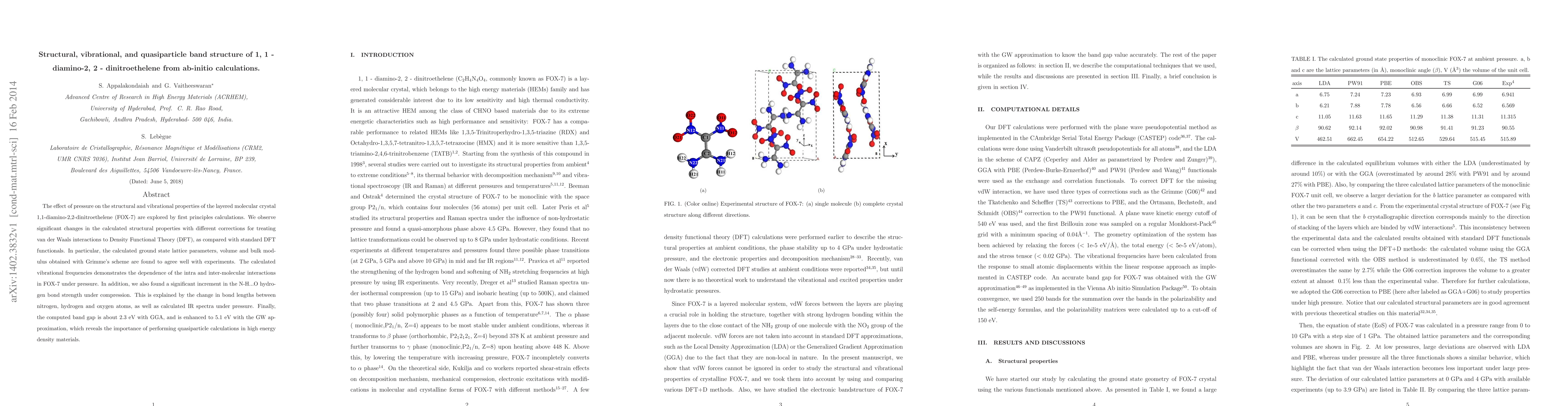 The effect of pressure on the structural and vibrational properties of the layered molecular crystal 1,1-diamino-2,2-dinitroethelene (FOX-7) are explored by first principles calculations. We observe significant changes in the calculated structural properties with different corrections for treating van der Waals interactions to Density Functional Theory (DFT), as compared with standard DFT functionals. In particular, the calculated ground state lattice parameters, volume and bulk modulus obtained with Grimme's scheme are found to agree well with experiments. The calculated vibrational frequencies demonstrates the dependence of the intra and inter-molecular interactions in FOX-7 under pressure. In addition, we also found a significant increment in the N-H...O hydrogen bond strength under compression. This is explained by the change in bond lengths between nitrogen, hydrogen and oxygen atoms, as well as calculated IR spectra under pressure. Finally, the computed band gap is about 2.3 eV with GGA, and is enhanced to 5.1 eV with the GW approximation, which reveals the importance of performing quasiparticle calculations in high energy density materials.