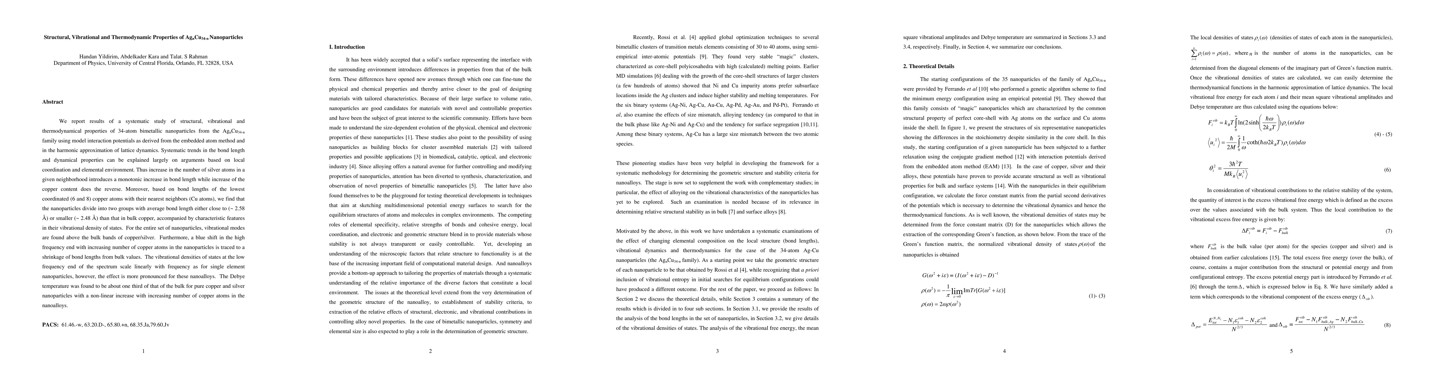 This study investigates the structural, vibrational, and thermodynamic properties of AgnCu34-n bimetallic nanoparticles, revealing systematic trends in bond lengths and dynamical properties influenced by local coordination and elemental environment. The nanoparticles exhibit distinct groups based on bond lengths and characteristic vibrational density features, with a blue shift in vibrational modes correlating to copper content.