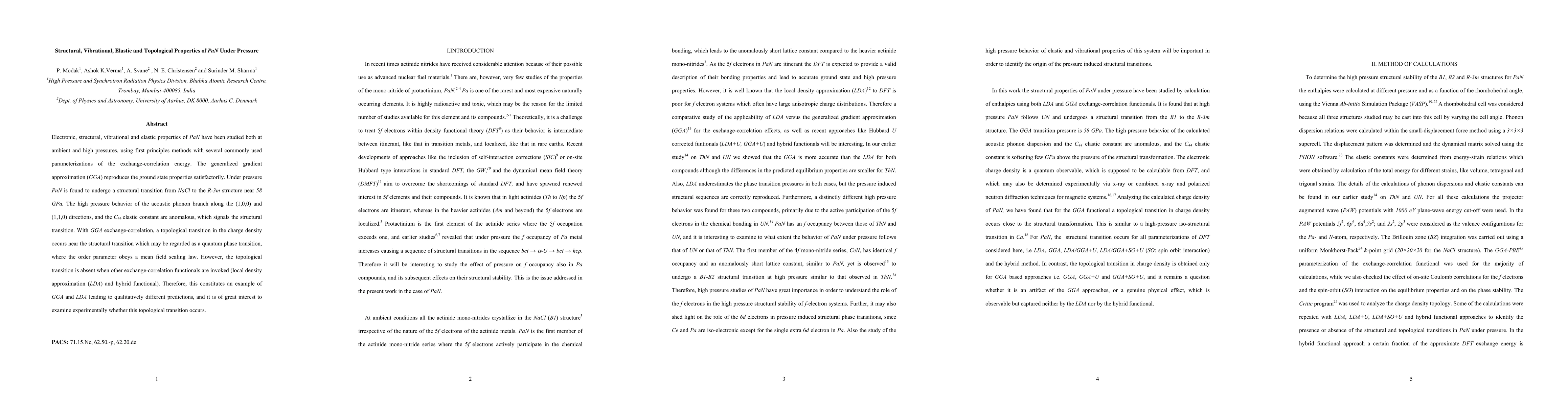 This study investigates the electronic, structural, vibrational, and elastic properties of PaN under pressure using first principles methods. PaN undergoes a structural transition from NaCl to R-3m near 58 GPa, accompanied by anomalous acoustic phonon behavior and a topological transition in charge density predicted by GGA, which is absent with LDA and hybrid functionals.