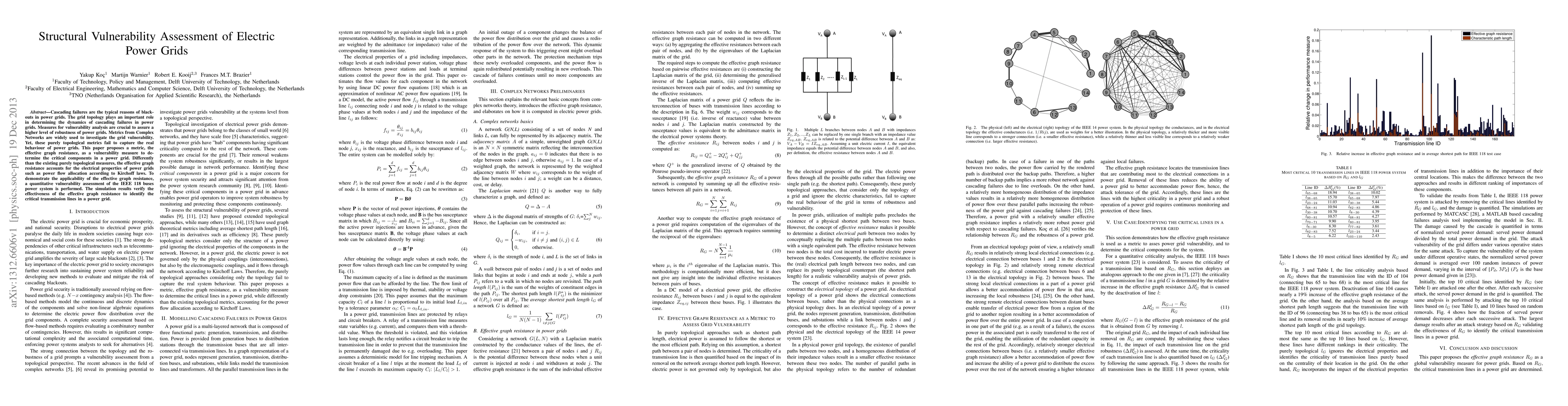 The paper proposes the effective graph resistance as a vulnerability measure for power grids, accounting for electrical properties such as power flow allocation according to Kirchhoff's laws. It demonstrates applicability through a quantitative vulnerability assessment of the IEEE 118 buses power system.