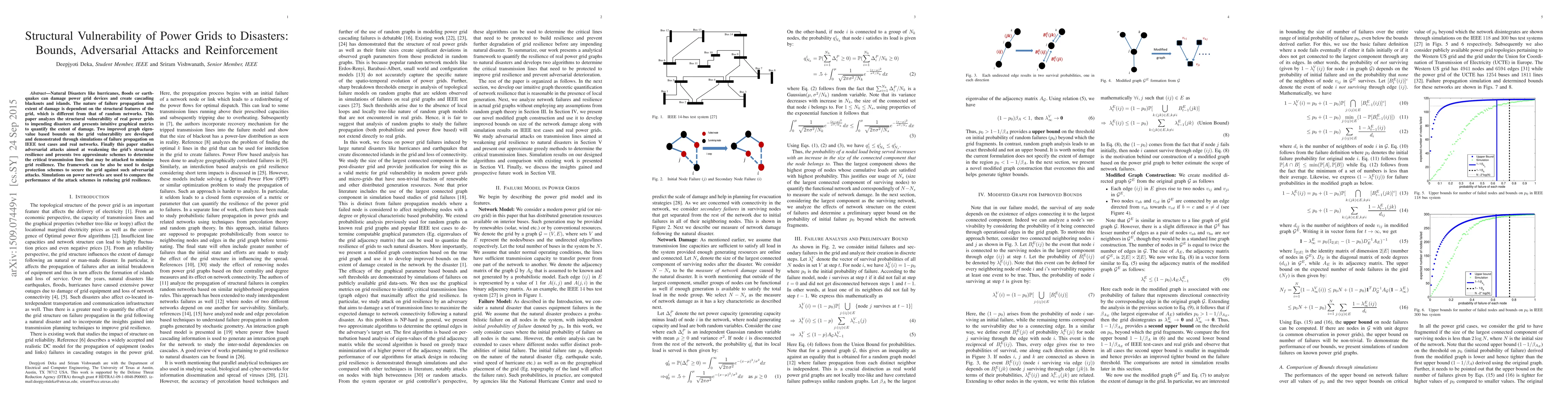 This paper investigates the structural vulnerability of power grids to natural disasters, developing graph eigen-value based bounds to quantify damage and proposing schemes to identify critical lines for potential adversarial attacks. The study also presents methods to enhance grid resilience against such attacks through simulations on real and test power networks.