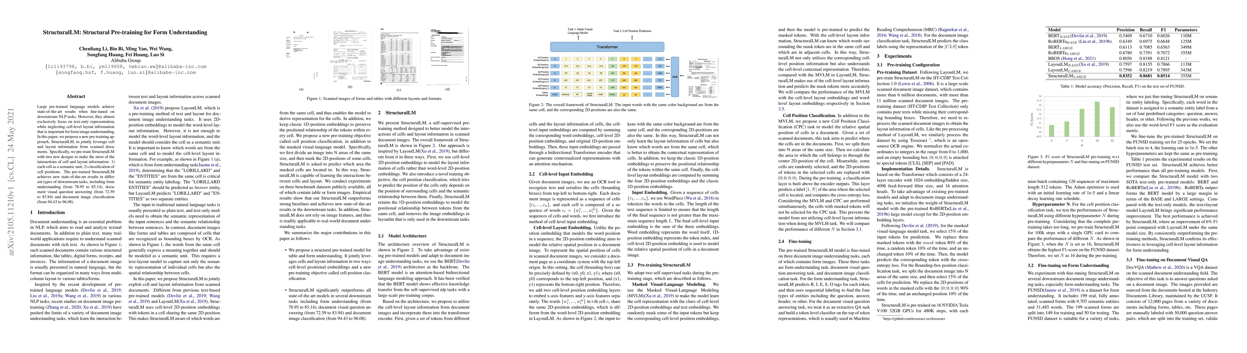 Large pre-trained language models achieve state-of-the-art results when fine-tuned on downstream NLP tasks. However, they almost exclusively focus on text-only representation, while neglecting cell-level layout information that is important for form image understanding. In this paper, we propose a new pre-training approach, StructuralLM, to jointly leverage cell and layout information from scanned documents. Specifically, we pre-train StructuralLM with two new designs to make the most of the interactions of cell and layout information: 1) each cell as a semantic unit; 2) classification of cell positions. The pre-trained StructuralLM achieves new state-of-the-art results in different types of downstream tasks, including form understanding (from 78.95 to 85.14), document visual question answering (from 72.59 to 83.94) and document image classification (from 94.43 to 96.08).