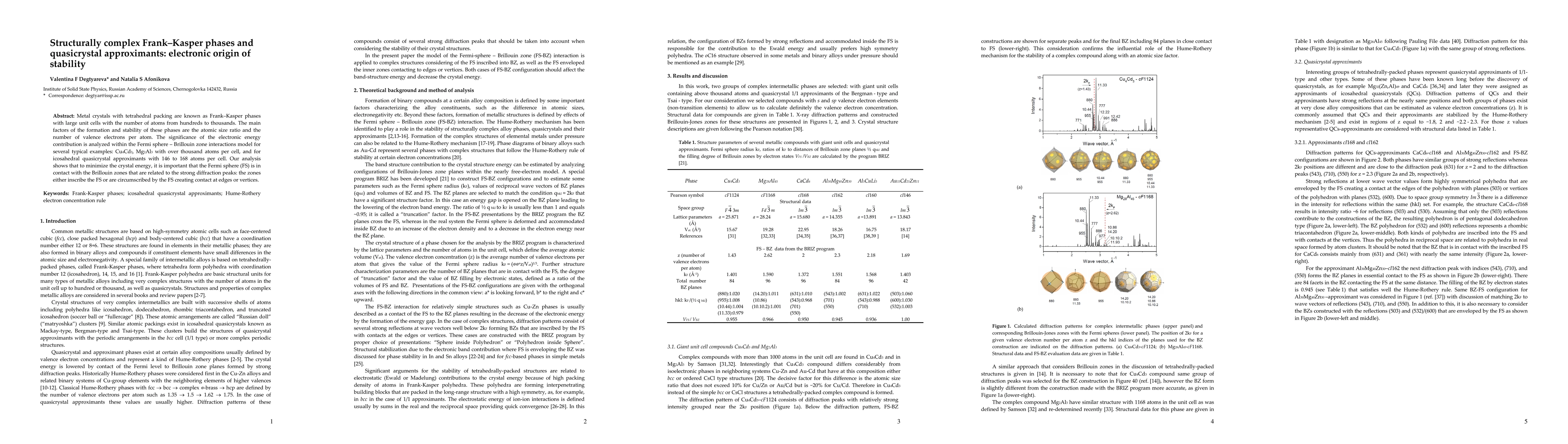 Metal crystals with tetrahedral packing are known as Frank-Kasper phases with large unit cells with the number of atoms from hundreds to thousands. The main factors of the formation and stability of these phases are the atomic size ratio and the number of valence electrons per atom. The significance of the electronic energy contribution is analyzed within the Fermi sphere - Brillouin zone interactions model for several typical examples: Cu4Cd3, Mg2Al3 with over thousand atoms per cell, and for icosahedral quasicrystal approximants with 146 to 168 atoms per cell. Our analysis shows that to minimize the crystal energy, it is important that the Fermi sphere (FS) is in contact with the Brillouin zones that are related to the strong diffraction peaks: the zones either inscribe the FS or are circumscribed by the FS creating contact at edges or vertices.