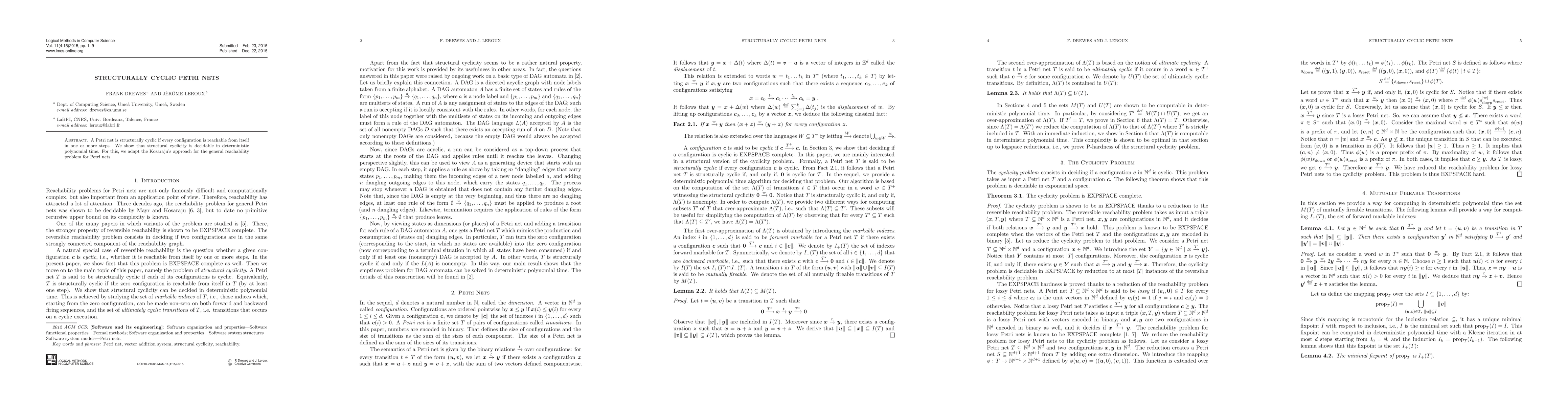 Summary: This paper demonstrates that structural cyclicity in Petri nets, where every configuration is reachable from itself, can be determined in deterministic polynomial time using an adapted version of Kosaraju's reachability algorithm. This provides a decidable method for assessing cyclic behavior in Petri nets.