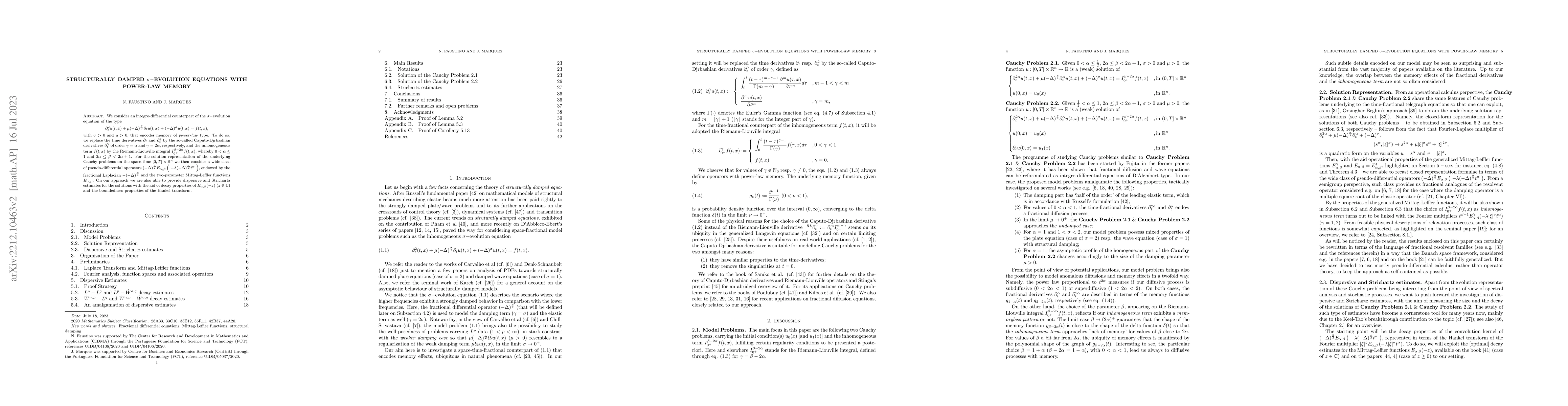 We consider an integro-differential counterpart of the $\sigma-$evolution equation of the type \[ \partial_t^2 u(t,x)+\mu (-\Delta)^{\frac{\sigma}{2}} \partial_t u(t,x)+(-\Delta)^\sigma u(t,x)=f(t,x), \] with $\sigma>0$ and $\mu>0$, that encodes memory of \textit{power-law} type. To do so, we replace the time derivatives $\partial_t$ and $\partial_t^2$ by the so-called Caputo-Djrbashian derivatives $\partial_t^\gamma$ of order $\gamma=\alpha$ and $\gamma=2\alpha$, respectively, and the inhomogeneous term $f(t,x)$ by the Riemann-Liouville integral $I^{\beta-2\alpha}_{0^+}f(t,x)$, whereby $0<\alpha\leq 1$ and $2\alpha\leq \beta<2\alpha+1$. For the solution representation of the underlying Cauchy problems on the space-time $[0,T]\times \mathbb{R}^n$ we then consider a wide class of pseudo-differential operators $\displaystyle (-\Delta)^{\frac{\eta}{2}}E_{\alpha,\beta}\left(~-\lambda(-\Delta)^{\frac{\sigma}{2}} t^\alpha~\right)$, endowed by the fractional Laplacian $-(-\Delta)^{\frac{\sigma}{2}}$ and the two-parameter Mittag-Leffler functions $E_{\alpha,\beta}$. On our approach we are also able to provide dispersive and Strichartz estimates for the solutions with the aid of decay properties of $E_{\alpha,\beta}(-z)$ ($z\in \mathbb{C}$) and the boundedness properties of the Hankel transform.