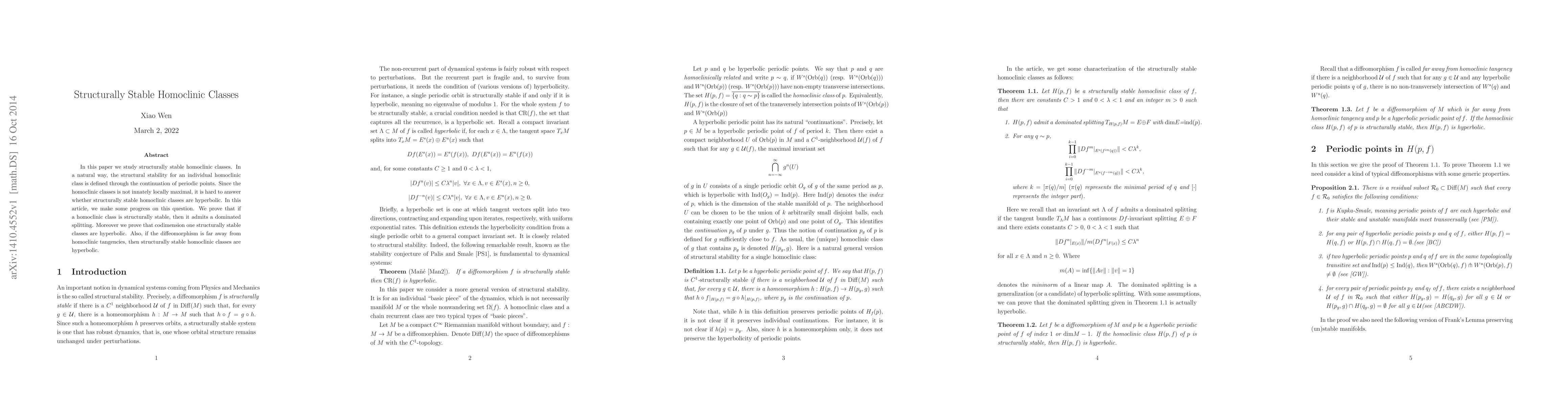 This paper investigates structurally stable homoclinic classes, proving that such classes admit a dominated splitting. It also establishes that codimension one structurally stable classes are hyperbolic, and shows that structurally stable homoclinic classes are hyperbolic when the diffeomorphism is sufficiently distant from homoclinic tangencies.