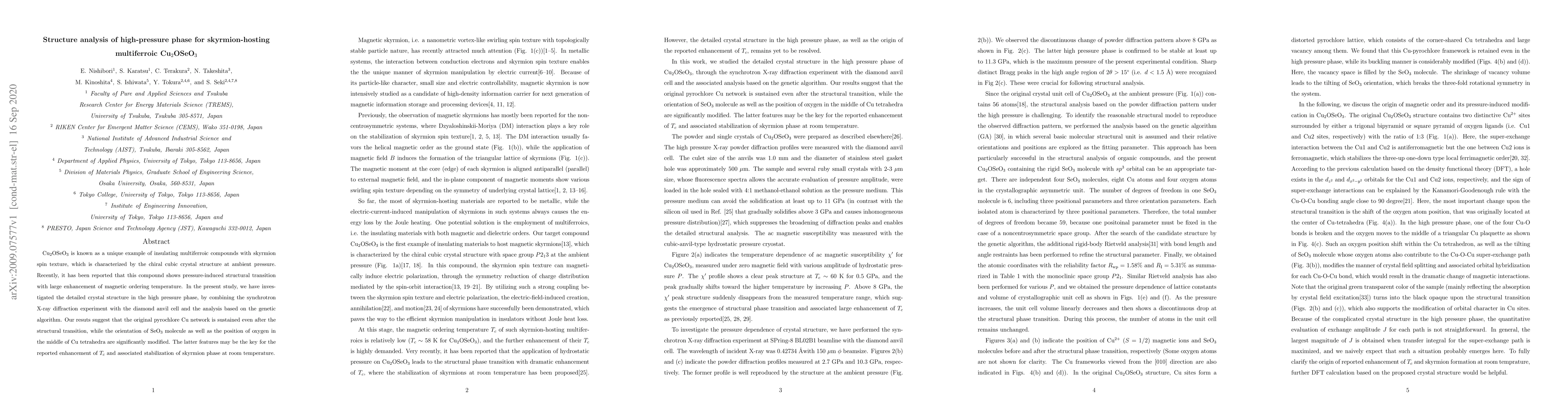 This study investigates the high-pressure phase of the multiferroic compound Cu2OSeO3, revealing that the original pyrochlore Cu network remains intact despite structural changes, which include significant modifications in the orientation of SeO3 molecules and oxygen positions, potentially explaining the enhanced magnetic ordering temperature and stabilization of skyrmion phase at room temperature.