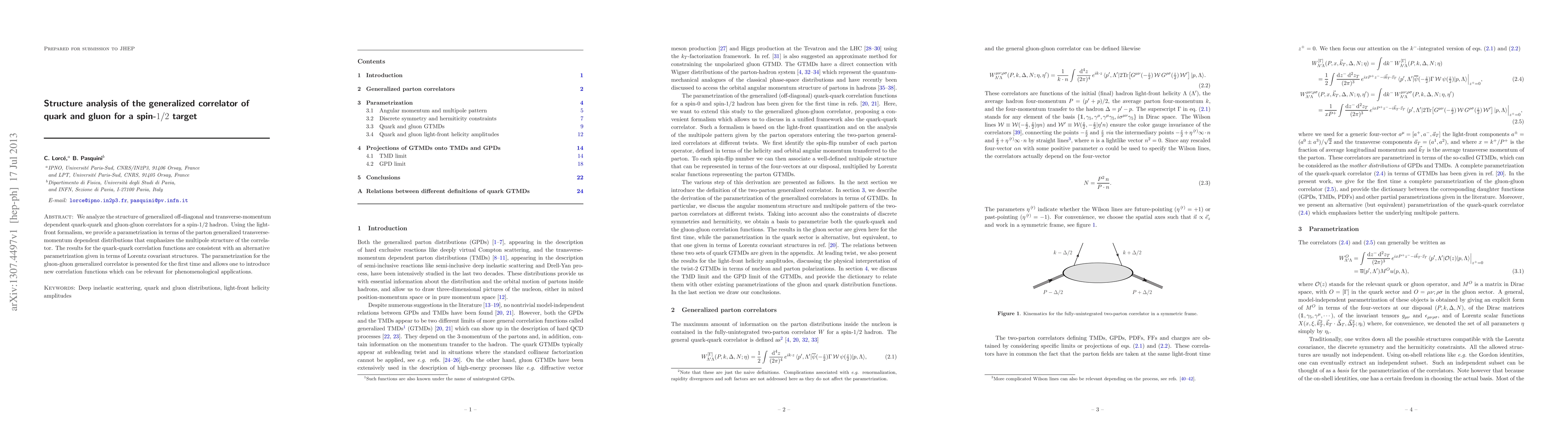 This paper analyzes the structure of generalized off-diagonal quark-quark and gluon-gluon correlators for a spin-1/2 hadron using the light-front formalism. It introduces a parametrization in terms of parton distributions, revealing the multipole structure and providing a new framework for phenomenological applications.