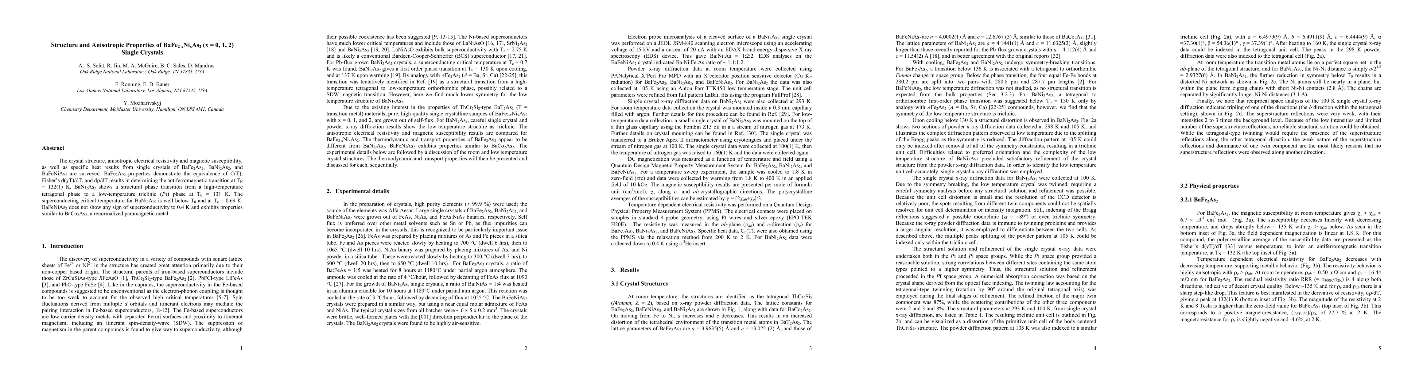 This study investigates the crystal structure and anisotropic properties of BaFe2-xNixAs2 single crystals (x = 0, 1, 2). BaFe2As2 shows antiferromagnetic transition at TN = 132(1) K, while BaNi2As2 undergoes a structural phase transition and exhibits superconductivity at Tc = 0.69 K. BaFeNiAs2 does not show superconductivity and behaves like a renormalized paramagnetic metal.