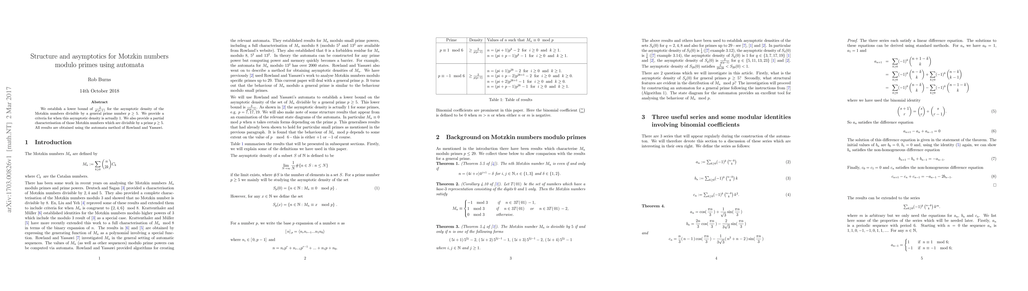 This paper establishes a lower bound for the asymptotic density of Motzkin numbers divisible by primes p > 3, showing it is at least 2/p(p-1), with criteria for when this density reaches 1. The results leverage the automata method developed by Rowland and Yassawi.