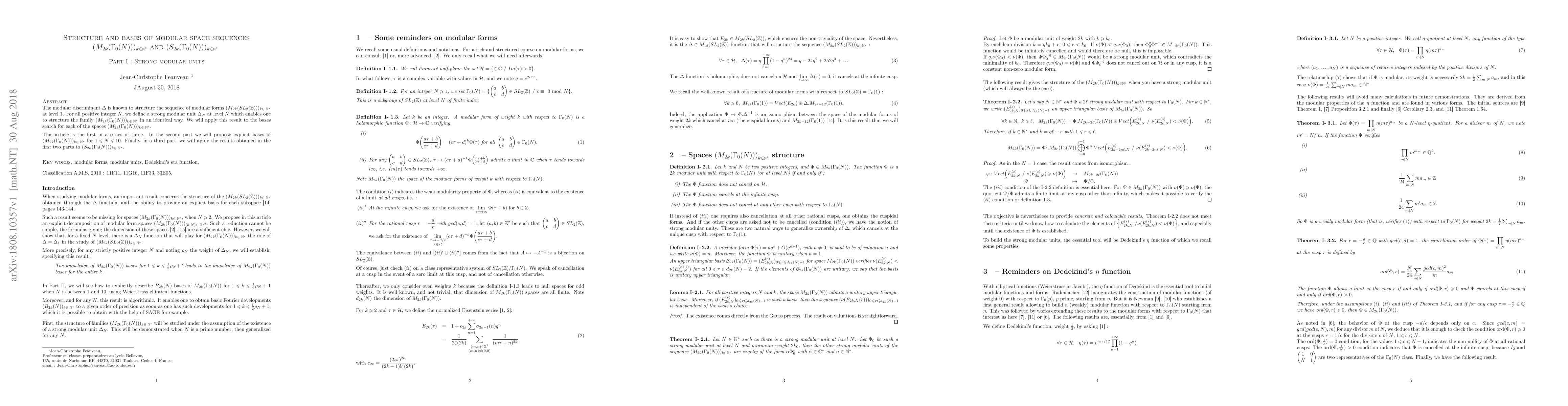 This paper introduces a strong modular unit $\Delta_N$ to structure sequences of modular forms $(M_{2k}(\Gamma_0(N)))_{k\in \mathbb{N}^*}$ for any positive integer $N$. It sets the foundation for finding bases of these modular spaces, with subsequent parts detailing explicit bases for $1\leq N \leq 10$ and applications to spaces $(S_{2k}(\Gamma_0(N)))_{k\in \; \mathbb{N}^*}$.