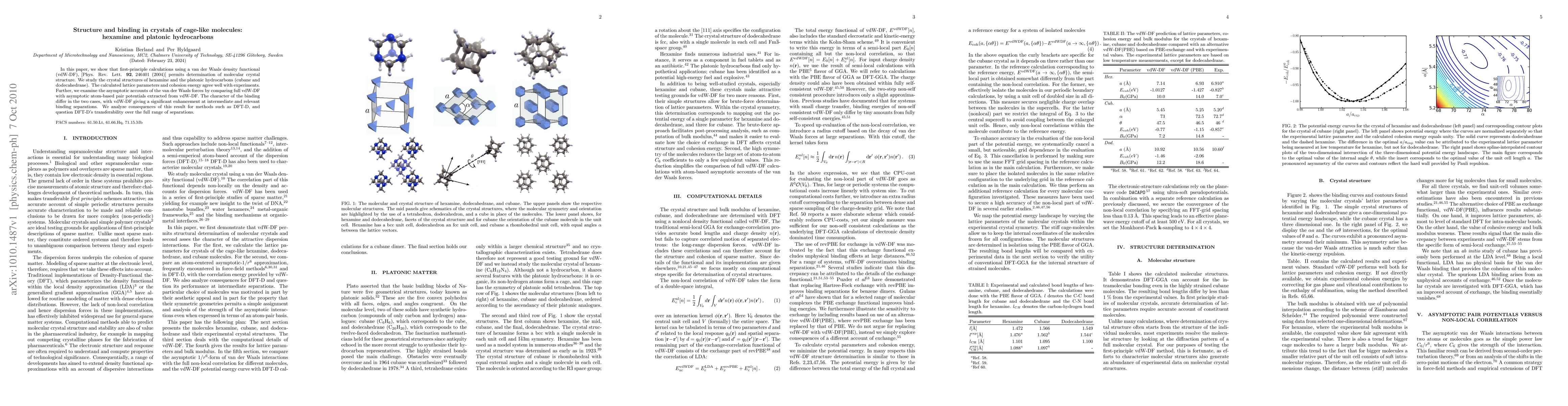 In this paper, we show that first-principle calculations using a van der Waals density functional (vdW-DF), [Phys. Rev. Lett. $\mathbf{92}$, 246401 (2004)] permits determination of molecular crystal structure. We study the crystal structures of hexamine and the platonic hydrocarbons (cubane and dodecahedrane). The calculated lattice parameters and cohesion energy agree well with experiments. Further, we examine the asymptotic accounts of the van der Waals forces by comparing full vdW-DF with asymptotic atom-based pair potentials extracted from vdW-DF. The character of the binding differ in the two cases, with vdW-DF giving a significant enhancement at intermediate and relevant binding separations. We analyze consequences of this result for methods such as DFT-D, and question DFT-D's transferability over the full range of separations.