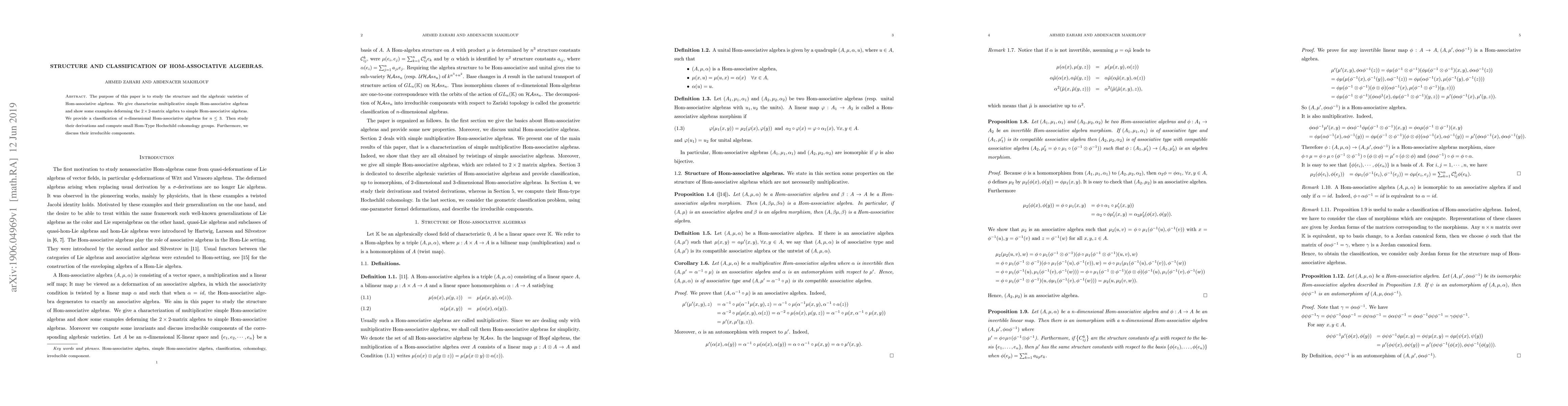 This paper explores the structure and classification of Hom-associative algebras, characterizing multiplicatively simple ones and classifying low-dimensional examples. It also investigates their derivations and small Hom-Type Hochschild cohomology groups, along with their irreducible components.