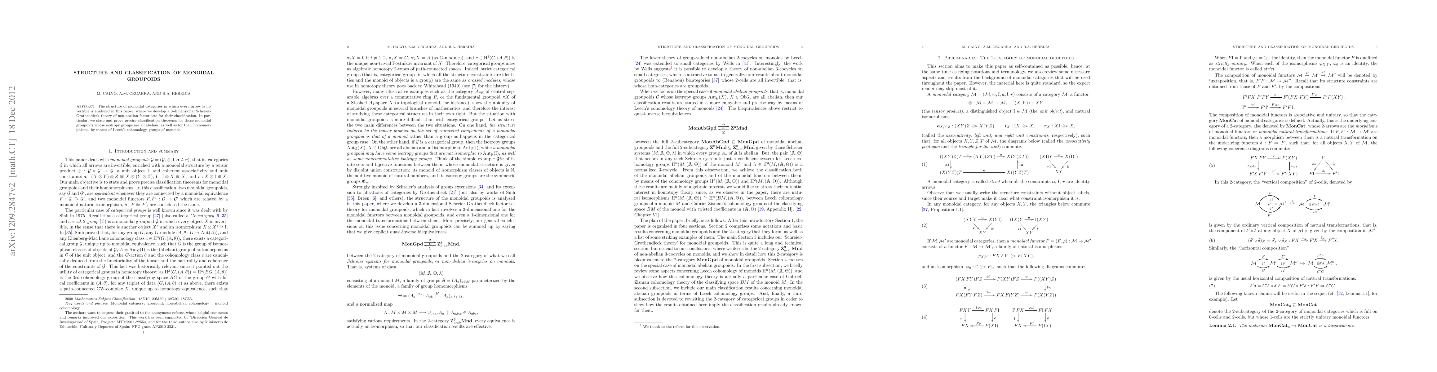 The structure of monoidal categories in which every arrow is invertible is analyzed in this paper, where we develop a 3-dimensional Schreier-Grothendieck theory of non-abelian factor sets for their classification. In particular, we state and prove precise classification theorems for those monoidal groupoids whose isotropy groups are all abelian, as well as for their homomorphisms, by means of Leech's cohomology groups of monoids.