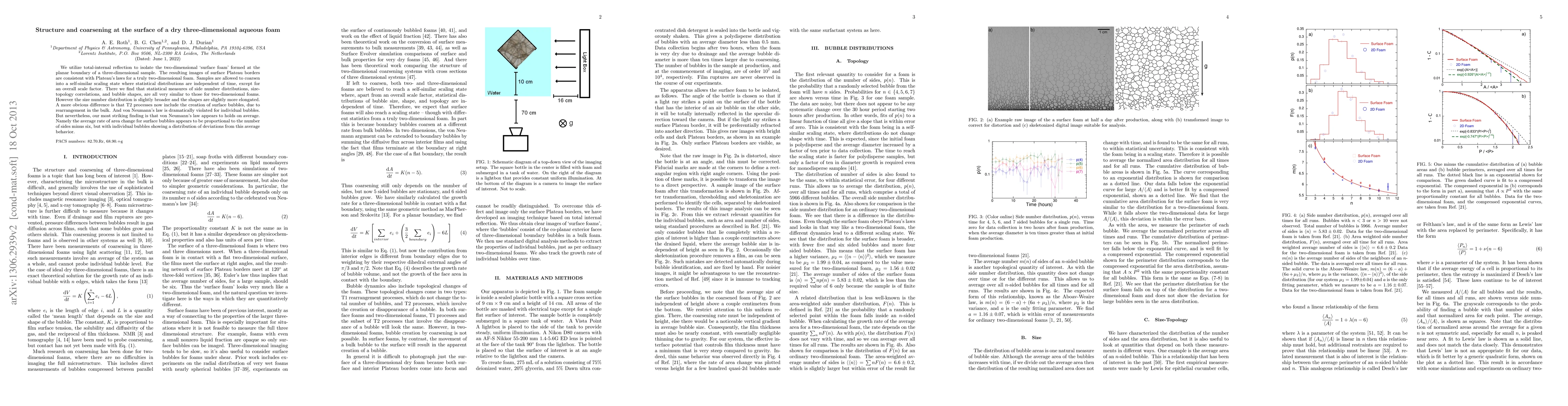 We utilize total-internal reflection to isolate the two-dimensional `surface foam' formed at the planar boundary of a three-dimensional sample. The resulting images of surface Plateau borders are consistent with Plateau's laws for a truly two-dimensional foam. Samples are allowed to coarsen into a self-similar scaling state where statistical distributions are independent of time, except for an overall scale factor. There we find that statistical measures of side number distributions, size-topology correlations, and bubble shapes, are all very similar to those for two-dimensional foams. However the size number distribution is slightly broader and the shapes are slightly more elongated. A more obvious difference is that T2 processes now include the creation of surface bubbles, due to rearrangement in the bulk. And von Neumann's law is dramatically violated for individual bubbles. But nevertheless, our most striking finding is that von Neumann's law appears to holds on average. Namely the average rate of area change for surface bubbles appears to be proportional to the number of sides minus six, but with individual bubbles showing a distribution of deviations from this average behavior.