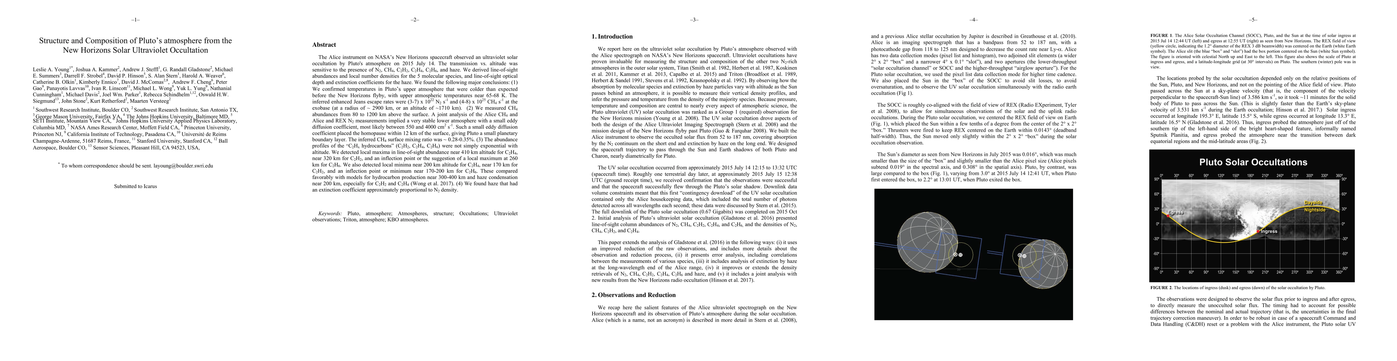 The New Horizons Alice instrument revealed Pluto's atmospheric composition and structure, showing colder upper atmosphere temperatures (~65-68 K) and complex hydrocarbon profiles, with local maxima and minima suggesting localized production and haze formation.