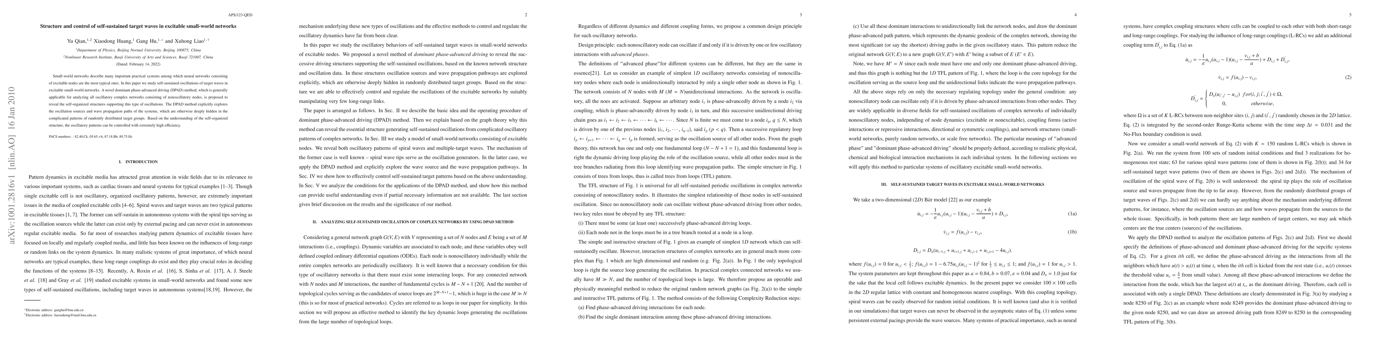 This paper investigates self-sustained oscillations of target waves in excitable small-world networks, proposing a novel dominant phase-advanced driving (DPAD) method to analyze and control these oscillations. The DPAD method reveals hidden oscillation sources and wave propagation paths, enabling highly efficient control of the oscillatory patterns.