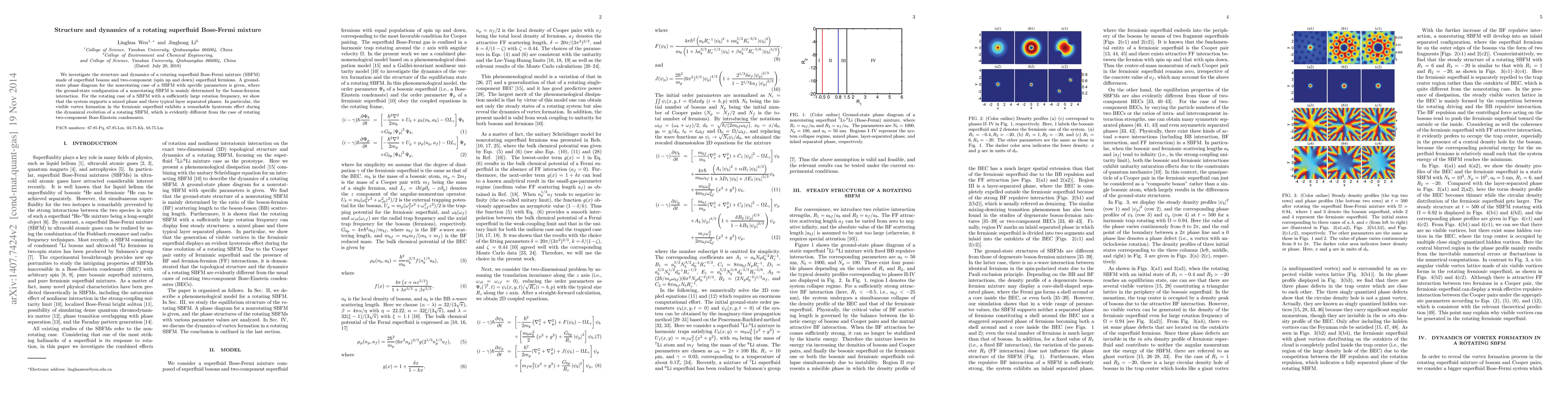 This paper explores the structure and dynamics of a rotating superfluid Bose-Fermi mixture, revealing distinct ground-state configurations based on boson-fermion interactions and identifying unique vortex formation and hysteresis effects in the fermionic superfluid under rotation.