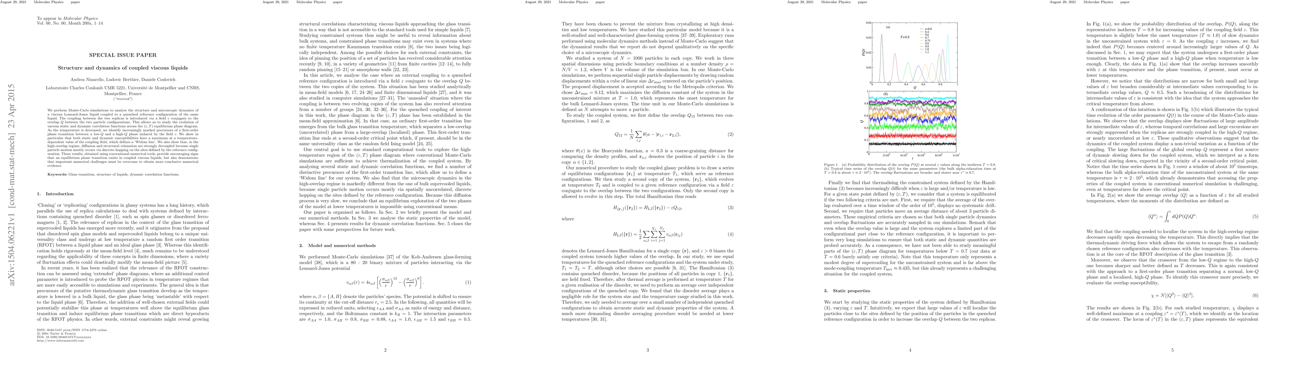 The paper presents Monte-Carlo simulations of coupled viscous Lennard-Jones liquids, revealing precursors of a first-order phase transition. As temperature decreases, static and dynamic susceptibilities peak at temperature-dependent coupling field values, marking a 'Widom line'. In high-overlap regime, particle motion is discrete, hopping between reference configuration sites, suggesting equilibrium phase transition but highlighting numerical challenges for definitive evidence.