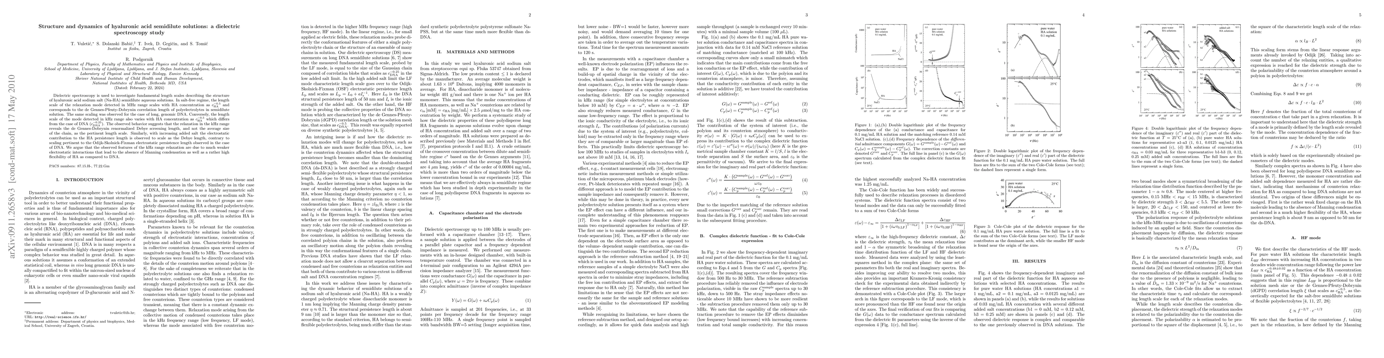 This paper uses dielectric spectroscopy to explore the structure and dynamics of hyaluronic acid (Na-HA) in semidilute aqueous solutions, finding that the relaxation mode in the MHz range scales with concentration as $c_\mathrm{HA}^{-0.5}$, indicative of polyelectrolyte behavior. The kHz range relaxation mode also scales with $c_\mathrm{HA}^{-0.5}$, suggesting a different length scale than DNA, likely due to weaker electrostatic interactions and higher flexibility of HA.