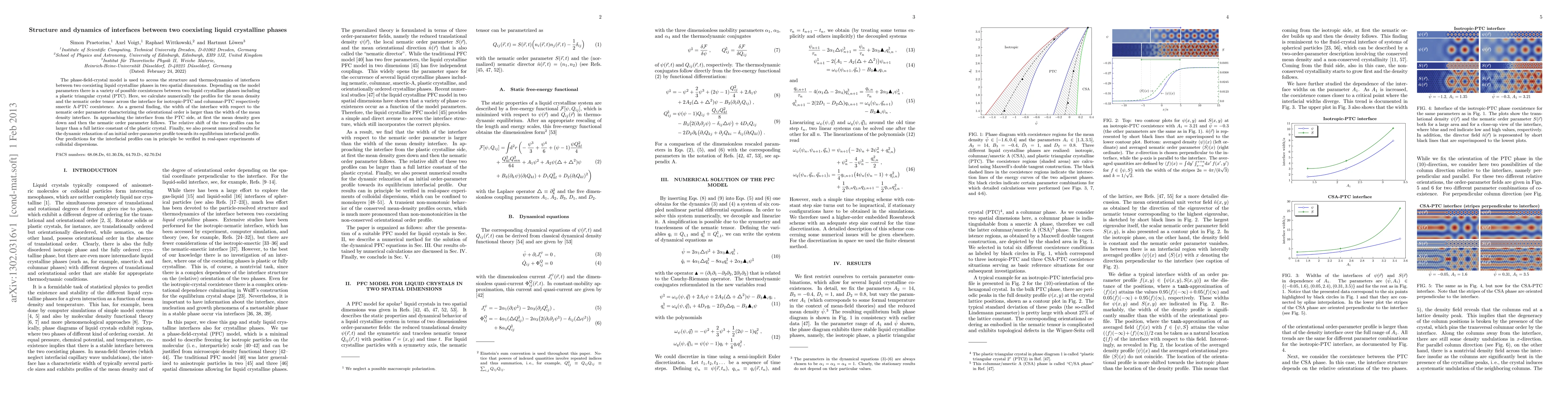 The phase-field-crystal model is used to access the structure and thermodynamics of interfaces between two coexisting liquid crystalline phases in two spatial dimensions. Depending on the model parameters there is a variety of possible coexistences between two liquid crystalline phases including a plastic triangular crystal (PTC). Here, we calculate numerically the profiles for the mean density and the nematic order tensor across the interface for isotropic-PTC and columnar-PTC respectively smectic A-PTC coexistence. As a general finding, the width of the interface with respect to the nematic order parameter characterizing the orientational order is larger than the width of the mean density interface. In approaching the interface from the PTC side, at first the mean density goes down and then the nematic order parameter follows. The relative shift of the two profiles can be larger than a full lattice constant of the plastic crystal. Finally, we also present numerical results for the dynamic relaxation of an initial order-parameter profile towards its equilibrium interfacial profile. Our predictions for the interfacial profiles can in principle be verified in real-space experiments of colloidal dispersions.
