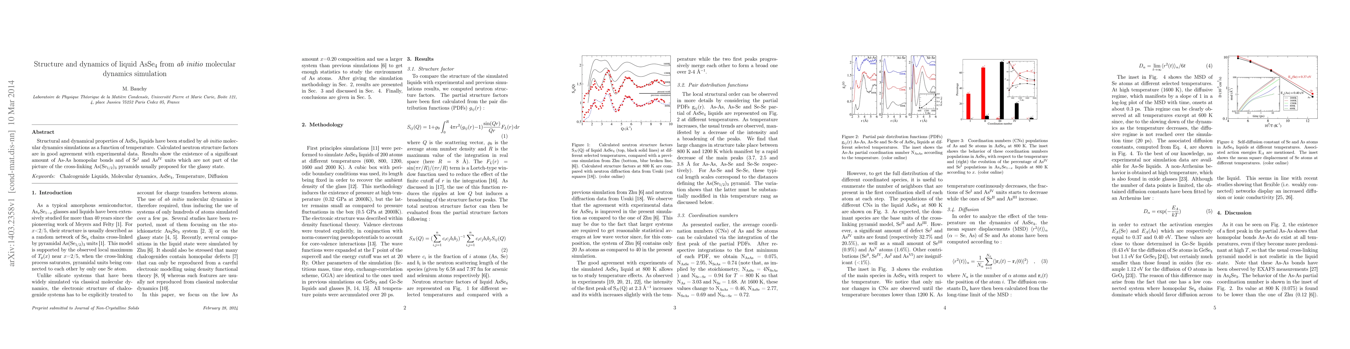 **Summary:** Ab initio molecular dynamics simulations reveal that liquid AsSe4 contains notable As-As homopolar bonds and SeI and AsIV units, challenging the conventional view of As(Se1/2)3 pyramids in its glassy state, with calculated neutron structure factors aligning well with experimental data.