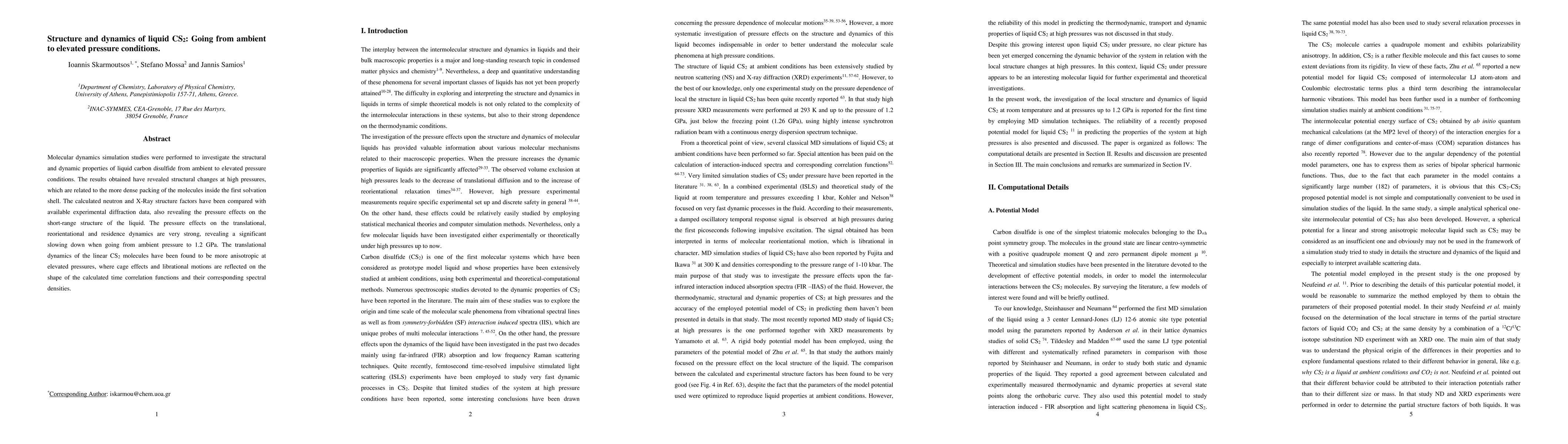 Molecular dynamics simulation studies were performed to investigate the structural and dynamic properties of liquid carbon disulfide from ambient to elevated pressure conditions. The results obtained have revealed structural changes at high pressures, which are related to the more dense packing of the molecules inside the first solvation shell. The calculated neutron and X-Ray structure factors have been compared with available experimental diffraction data, also revealing the pressure effects on the short-range structure of the liquid. The pressure effects on the translational, reorientational and residence dynamics are very strong, revealing a significant slowing down when going from ambient pressure to 1.2 GPa. The translational dynamics of the linear CS2 molecules have been found to be more anisotropic at elevated pressures, where cage effects and librational motions are reflected on the shape of the calculated time correlation functions and their corresponding spectral densities.