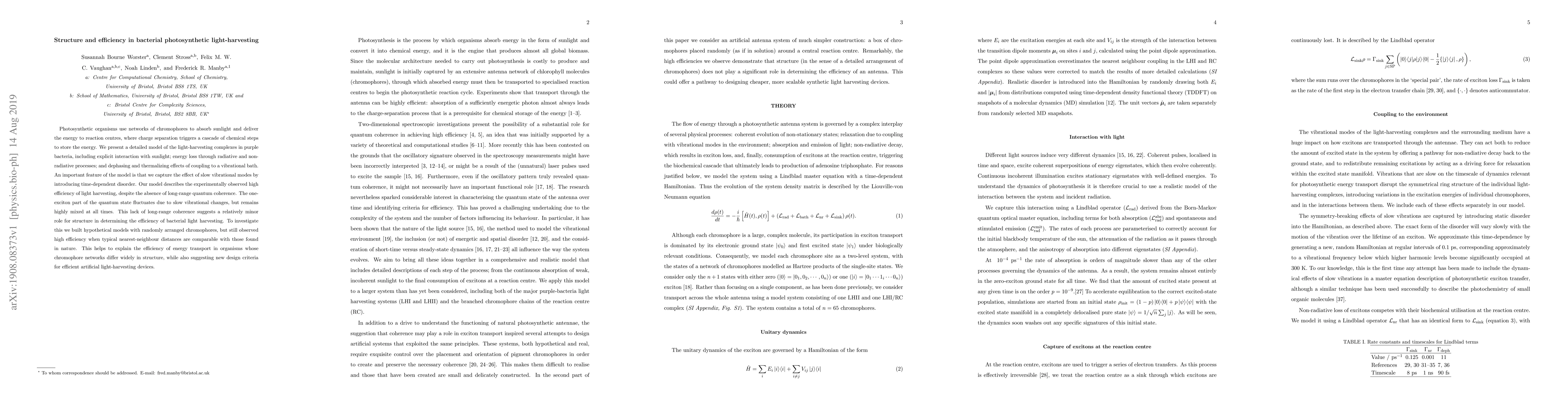 Photosynthetic organisms use networks of chromophores to absorb sunlight and deliver the energy to reaction centres, where charge separation triggers a cascade of chemical steps to store the energy. We present a detailed model of the light-harvesting complexes in purple bacteria, including explicit interaction with sunlight; energy loss through radiative and non-radiative processes; and dephasing and thermalizing effects of coupling to a vibrational bath. An important feature of the model is that we capture the effect of slow vibrational modes by introducing time-dependent disorder. Our model describes the experimentally observed high efficiency of light harvesting, despite the absence of long-range quantum coherence. The one-exciton part of the quantum state fluctuates due to slow vibrational changes, but remains highly mixed at all times. This lack of long-range coherence suggests a relatively minor role for structure in determining the efficiency of bacterial light harvesting. To investigate this we built hypothetical models with randomly arranged chromophores, but still observed high efficiency when typical nearest-neighbour distances are comparable with those found in nature. This helps to explain the efficiency of energy transport in organisms whose chromophore networks differ widely in structure, while also suggesting new design criteria for efficient artificial light-harvesting devices.