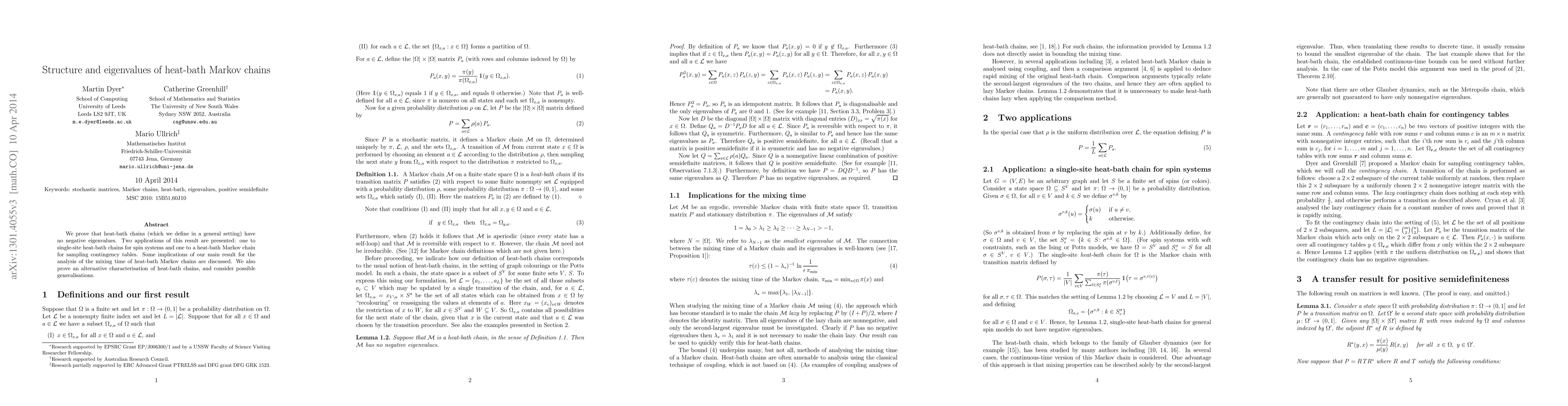 Researchers prove that heat-bath Markov chains have no negative eigenvalues, which has implications for analyzing their mixing time and potential applications in spin systems and contingency table sampling.