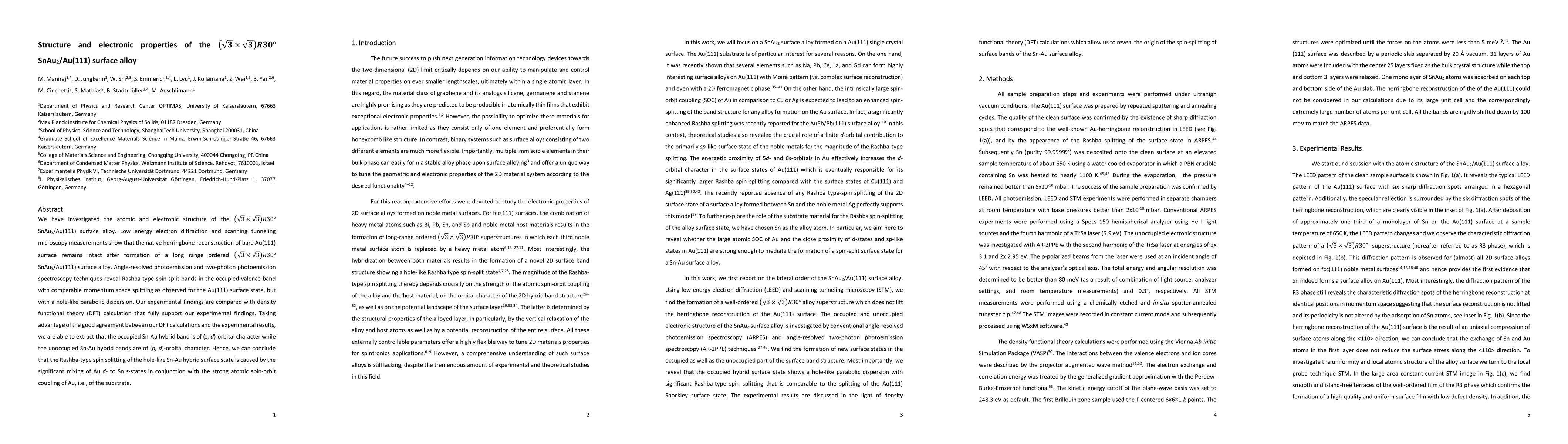 This study investigates the atomic and electronic structure of a ($\sqrt{3}\times \sqrt{3}$) $R30^{\circ}$ SnAu$_2$/Au(111) surface alloy, revealing Rashba-type spin-split bands and a hole-like parabolic dispersion. Density functional theory calculations corroborate experimental findings, indicating the occupied Sn-Au hybrid band has (s, d)-orbital character, while unoccupied bands exhibit (p, d)-orbital character.