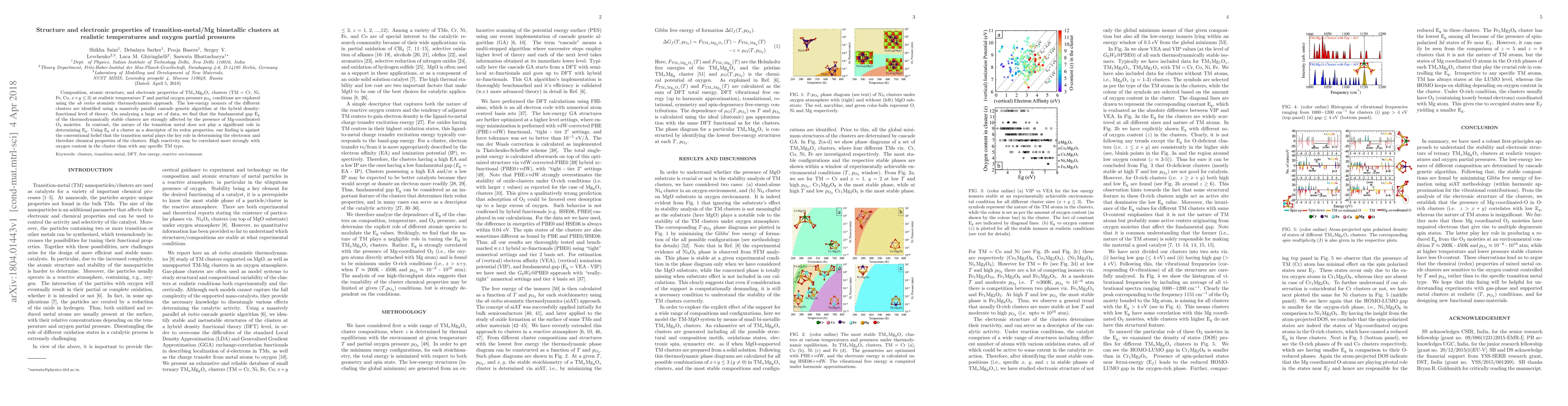 Composition, atomic structure, and electronic properties of TM$_x$Mg$_y$O$_z$ clusters (TM = Cr, Ni, Fe, Co, $x+y \leq 3$) at realistic temperature $T$ and partial oxygen pressure $p_{\textrm{O}_2}$ conditions are explored using the {\em ab initio} atomistic thermodynamics approach. The low-energy isomers of the different clusters are identified using a massively parallel cascade genetic algorithm at the hybrid density-functional level of theory. On analyzing a large set of data, we find that the fundamental gap E$_\textrm{g}$ of the thermodynamically stable clusters are strongly affected by the presence of Mg-coordinated O$_2$ moieties. In contrast, the nature of the transition metal does not play a significant role in determining E$_\textrm{g}$. Using E$_\textrm{g}$ of a cluster as a descriptor of its redox properties, our finding is against the conventional belief that the transition metal plays the key role in determining the electronic and therefore chemical properties of the clusters. High reactivity may be correlated more strongly with oxygen content in the cluster than with any specific TM type.