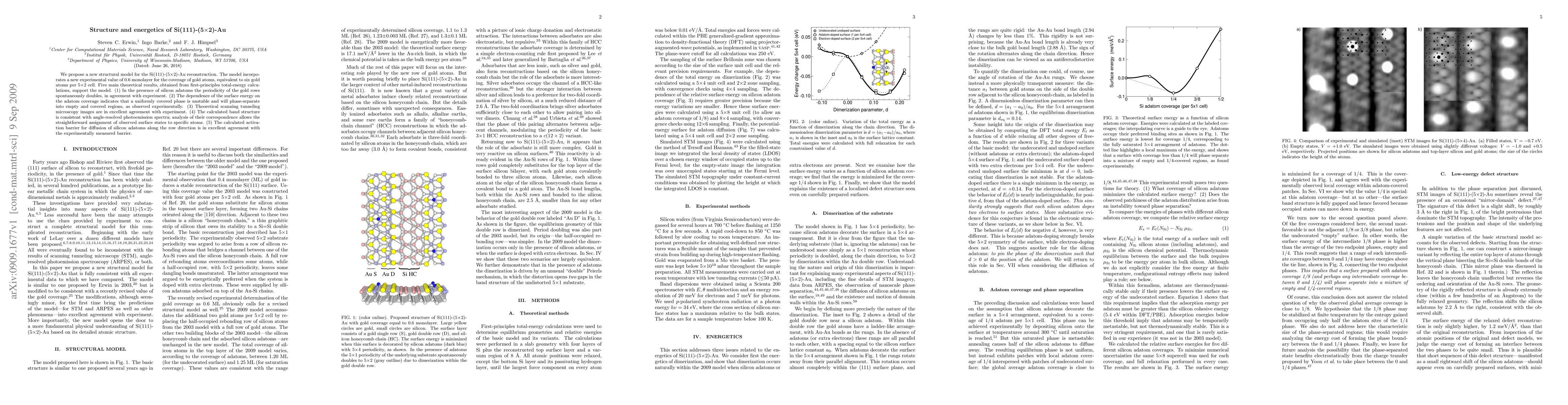 We propose a new structural model for the Si(111)-(5x2)-Au reconstruction. The model incorporates a new experimental value of 0.6 monolayer for the coverage of gold atoms, equivalent to six gold atoms per 5x2 cell. Five main theoretical results, obtained from first-principles total-energy calculations, support the model. (1) In the presence of silicon adatoms the periodicity of the gold rows spontaneously doubles, in agreement with experiment. (2) The dependence of the surface energy on the adatom coverage indicates that a uniformly covered phase is unstable and will phase-separate into empty and covered regions, as observed experimentally. (3) Theoretical scanning tunneling microscopy images are in excellent agreement with experiment. (4) The calculated band structure is consistent with angle-resolved photoemission spectra; analysis of their correspondence allows the straightforward assignment of observed surface states to specific atoms. (5) The calculated activation barrier for diffusion of silicon adatoms along the row direction is in excellent agreement with the experimentally measured barrier.