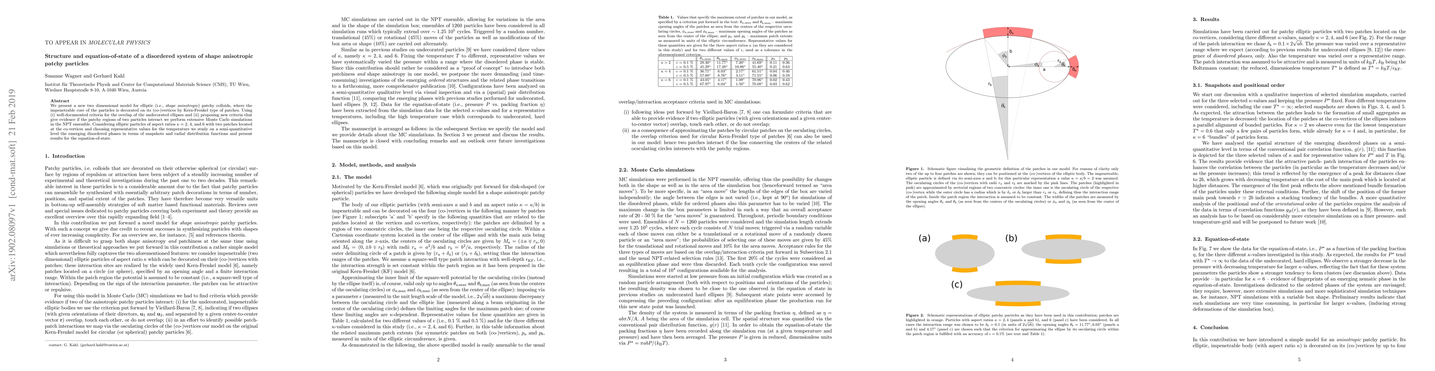 This paper introduces a two-dimensional model for elliptic, shape anisotropic patchy colloids and uses Monte Carlo simulations to study their disordered phases and equation-of-state. The model considers elliptic particles with patches at co-vertices and explores phase behavior for different aspect ratios and temperatures.