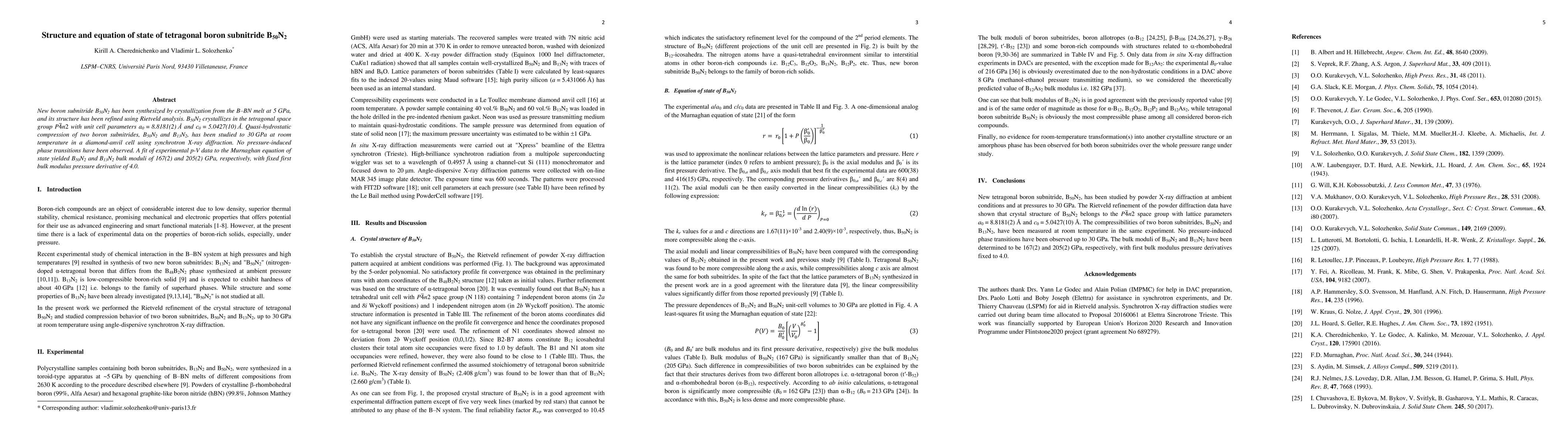 This paper reports the synthesis and crystal structure of tetragonal boron subnitride B50N2, which crystallizes in the P-4n2 space group. The material's equation of state was determined via quasi-hydrostatic compression, revealing bulk moduli of 167(2) GPa without phase transitions up to 30 GPa.