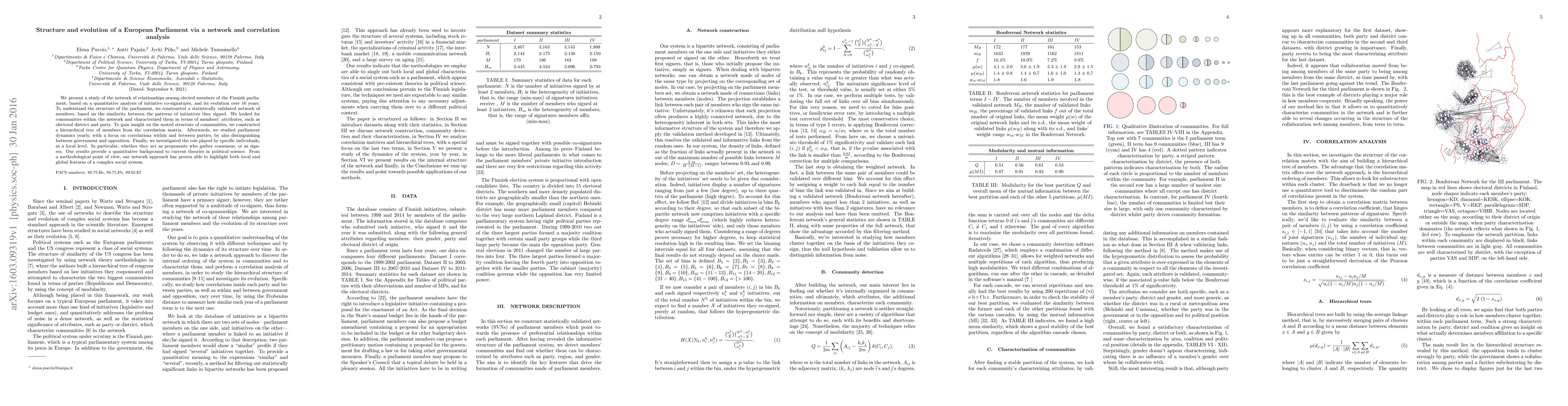 We present a study of the network of relationships among elected members of the Finnish parliament, based on a quantitative analysis of initiative co-signatures, and its evolution over 16 years. To understand the structure of the parliament, we constructed a statistically validated network of members, based on the similarity between the patterns of initiatives they signed. We looked for communities within the network and characterized them in terms of members' attributes, such as electoral district and party. To gain insight on the nested structure of communities, we constructed a hierarchical tree of members from the correlation matrix. Afterwards, we studied parliament dynamics yearly, with a focus on correlations within and between parties, by also distinguishing between government and opposition. Finally, we investigated the role played by specific individuals, at a local level. In particular, whether they act as proponents who gather consensus, or as signers. Our results provide a quantitative background to current theories in political science. From a methodological point of view, our network approach has proven able to highlight both local and global features of a complex social system.