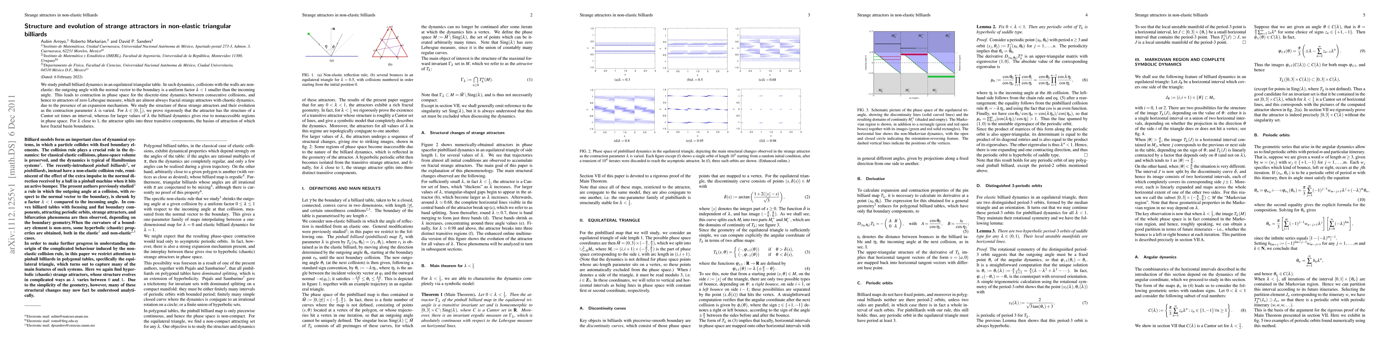 We study pinball billiard dynamics in an equilateral triangular table. In such dynamics, collisions with the walls are non-elastic: the outgoing angle with the normal vector to the boundary is a uniform factor $\lambda < 1$ smaller than the incoming angle. This leads to contraction in phase space for the discrete-time dynamics between consecutive collisions, and hence to attractors of zero Lebesgue measure, which are almost always fractal strange attractors with chaotic dynamics, due to the presence of an expansion mechanism. We study the structure of these strange attractors and their evolution as the contraction parameter $\lambda$ is varied. For $\lambda$ in the interval (0, 1/3), we prove rigorously that the attractor has the structure of a Cantor set times an interval, whereas for larger values of $\lambda$ the billiard dynamics gives rise to nonaccessible regions in phase space. For $\lambda$ close to 1, the attractor splits into three transitive components, the basins of attraction of which have fractal basin boundaries.